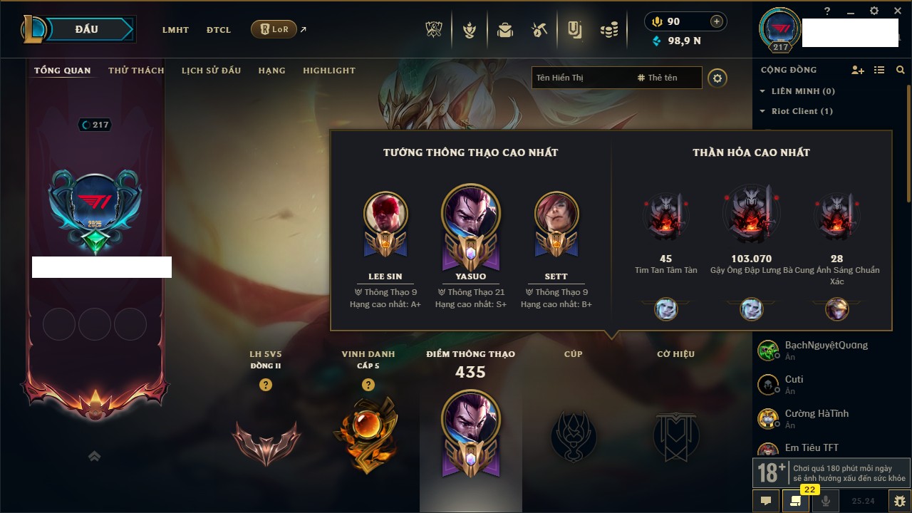 Rank Đơn: Chưa Rank Khung: Đồng Tướng: 171 - Còn 82665 THX Trang Phục: 45 Rank ĐTCL: Chưa Rank Linh Thú: 95