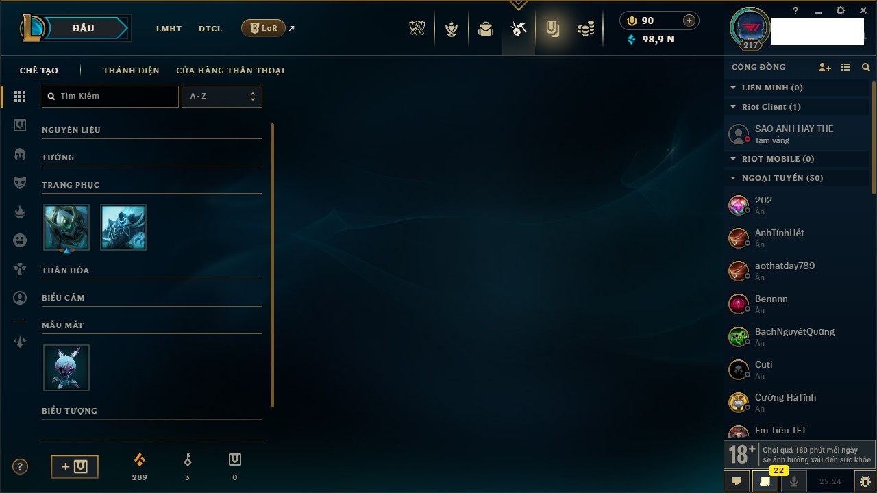 Rank Đơn: Chưa Rank Khung: Chưa có khung Tướng: 157 - Còn 51905 THX Trang Phục: 3 Rank ĐTCL: Chưa Rank Linh Thú: 175