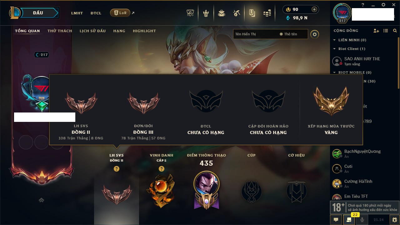 Rank Đơn: Chưa Rank Khung: Bạc Tướng: 171 - Còn 140501 THX Trang Phục: 58 Rank ĐTCL: Chưa Rank Linh Thú: 87