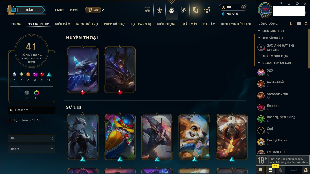 Rank Đơn: Chưa Rank Khung: Chưa có khung Tướng: 171 - Còn 52162 THX Trang Phục: 78 Rank ĐTCL: Chưa Rank Linh Thú: 145
