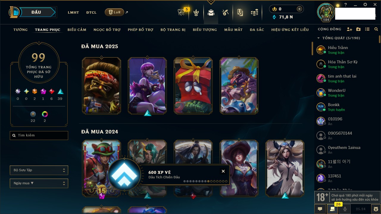 Rank Đơn: Chưa Rank Khung: Đồng Tướng: 171 - Còn 82665 THX Trang Phục: 45 Rank ĐTCL: Chưa Rank Linh Thú: 95