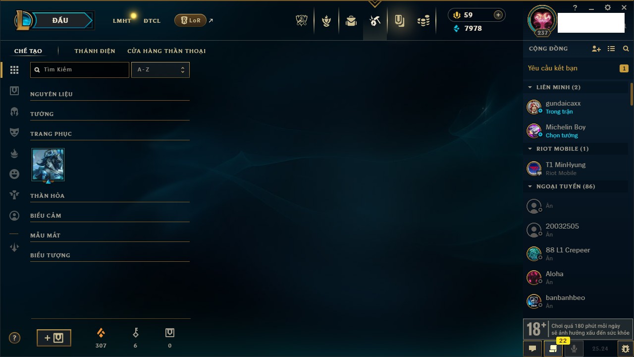 Rank Đơn: Chưa RankKhung: Chưa có khungTướng: 172 - Còn 124206 THXTrang Phục: 232Rank ĐTCL: Chưa RankLinh Thú: 112