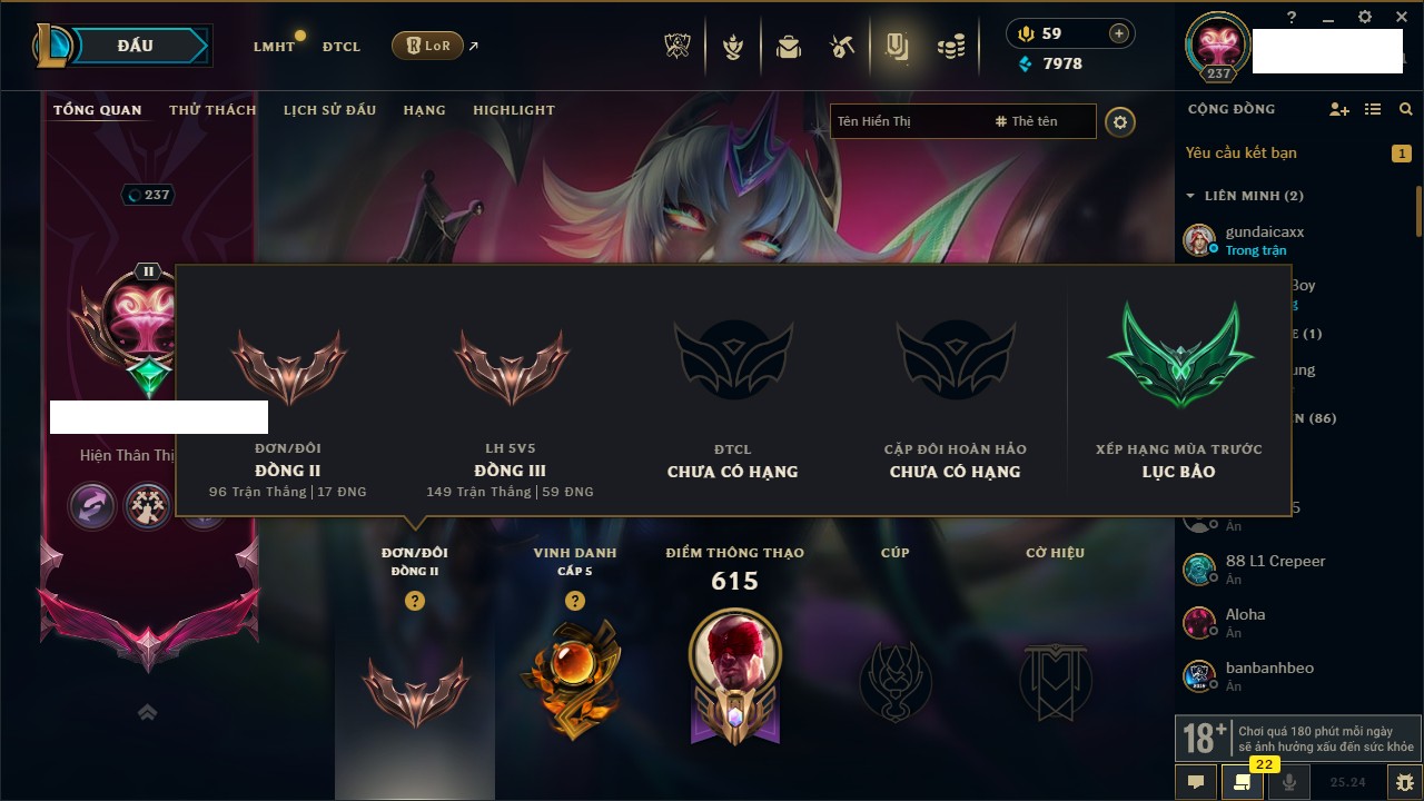 Rank Đơn: Chưa RankKhung: Bạch kimTướng: 172 - Còn 81 THXTrang Phục: 226Rank ĐTCL: Chưa RankLinh Thú: 193