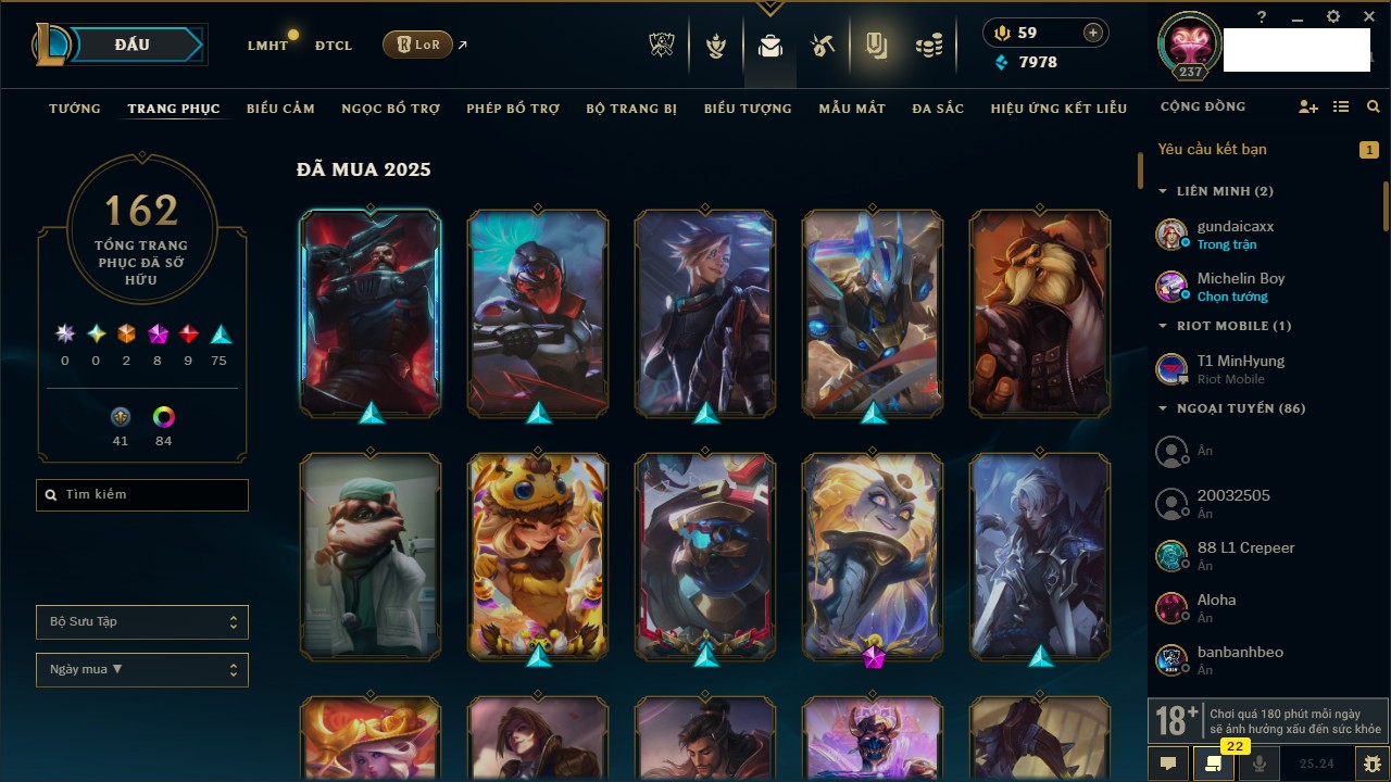 Rank Đơn: Chưa RankKhung: Chưa có khungTướng: 157 - Còn 2008 THXTrang Phục: 206Rank ĐTCL: Chưa RankLinh Thú: 29