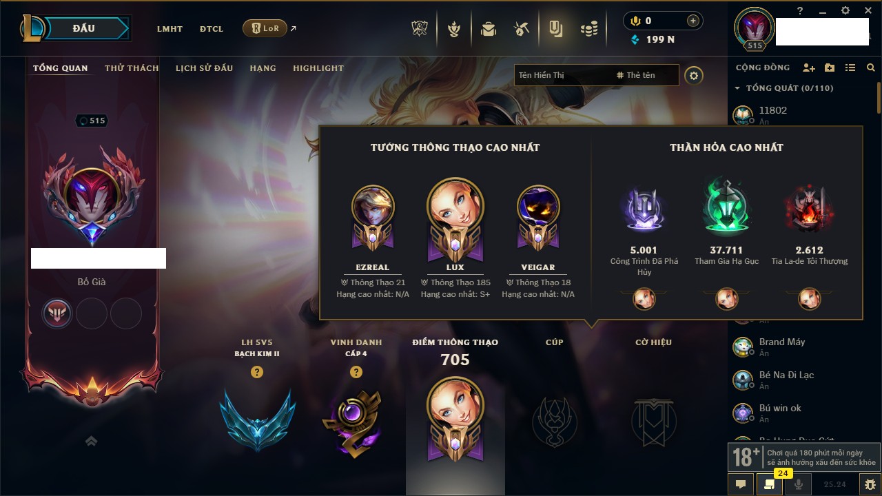 - Cho'Gath 1,726,822 Thông Thạo - 2 huy chương - 3125 pha lê - 145 Tinh Hoa Thần Thoại - Có pét- Thresh Cao Bồi Đột Phá
