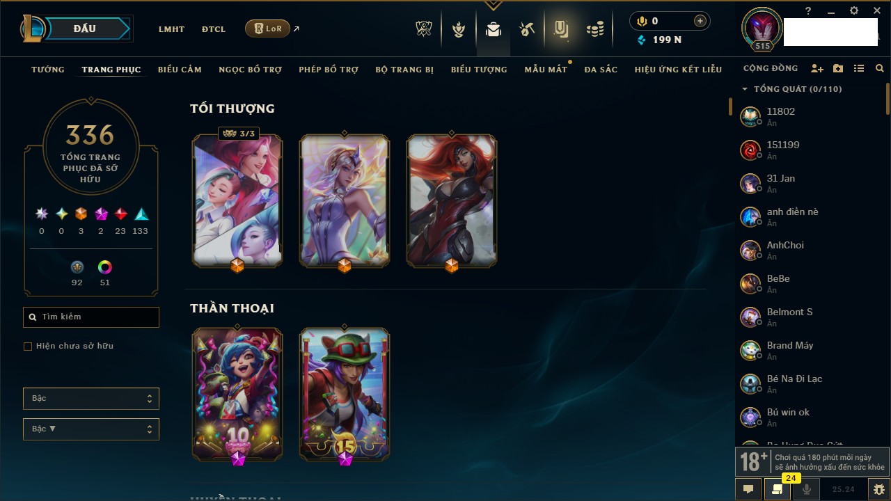 Rank Đơn: Chưa Rank Khung: Chưa có khung Tướng: 165 - Còn 1609 THX Trang Phục: 25 Rank ĐTCL: Chưa Rank Linh Thú: 44