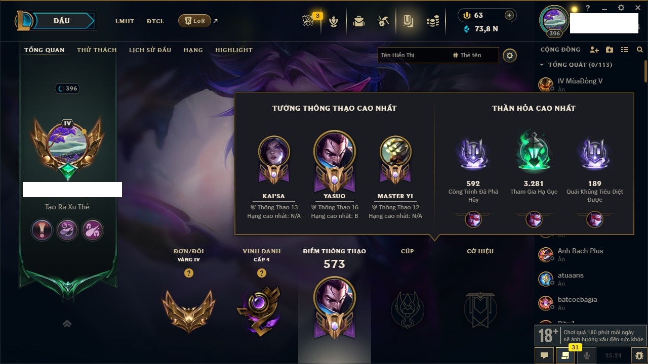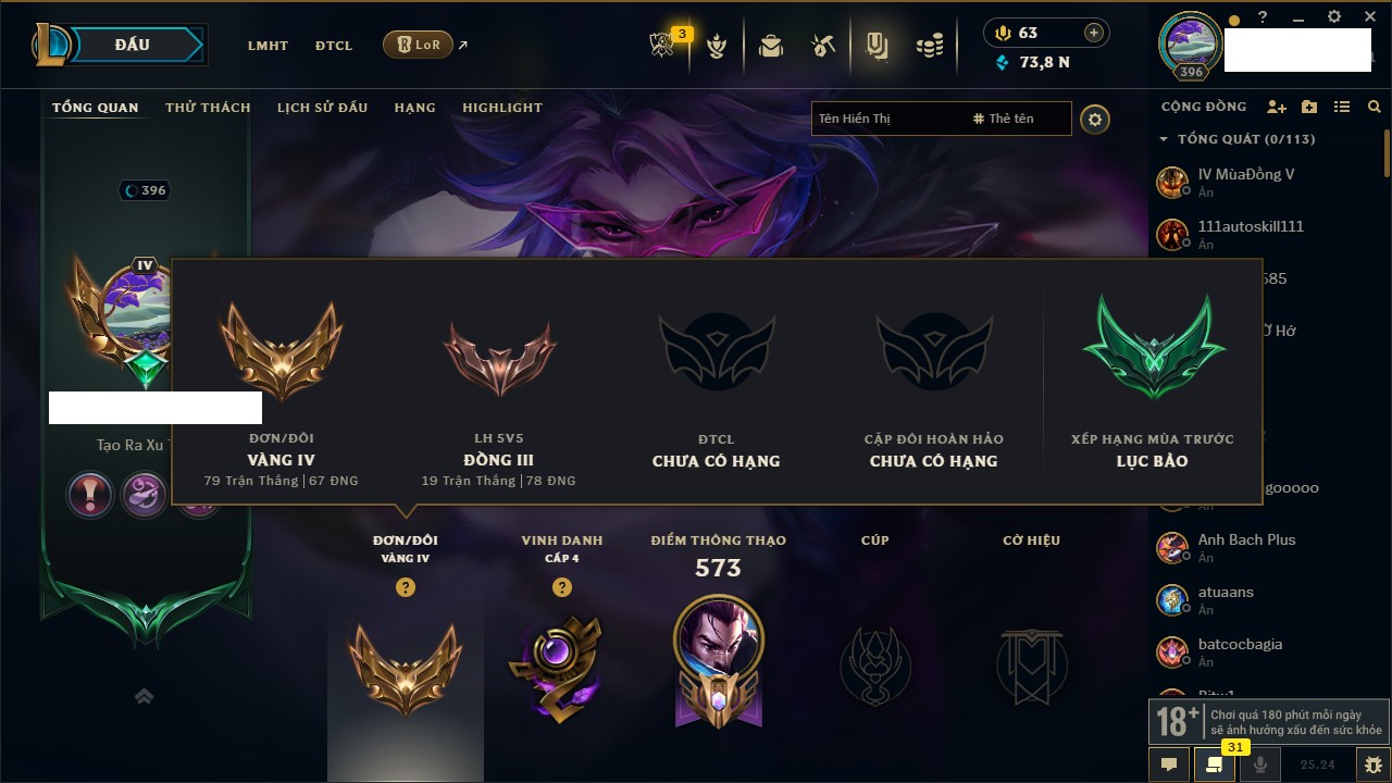 Rank Đơn: Chưa RankKhung: Bạch kimTướng: 172 - Còn 81 THXTrang Phục: 226Rank ĐTCL: Chưa RankLinh Thú: 193