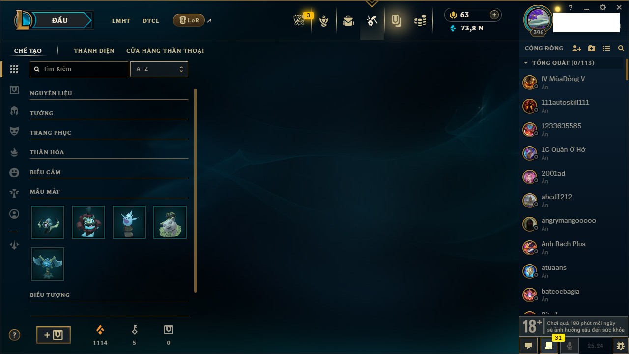 Rank Đơn: Chưa RankKhung: Chưa có khungTướng: 172 - Còn 124206 THXTrang Phục: 232Rank ĐTCL: Chưa RankLinh Thú: 112