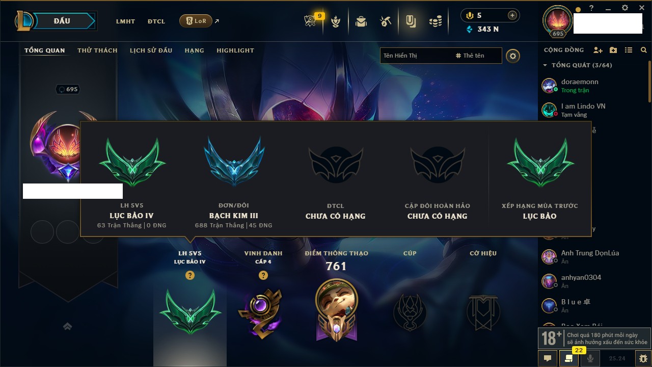 Rank Đơn: Chưa RankKhung: Bạch kimTướng: 172 - Còn 59200 THXTrang Phục: 471Rank ĐTCL: Bạch Kim IIILinh Thú: 114