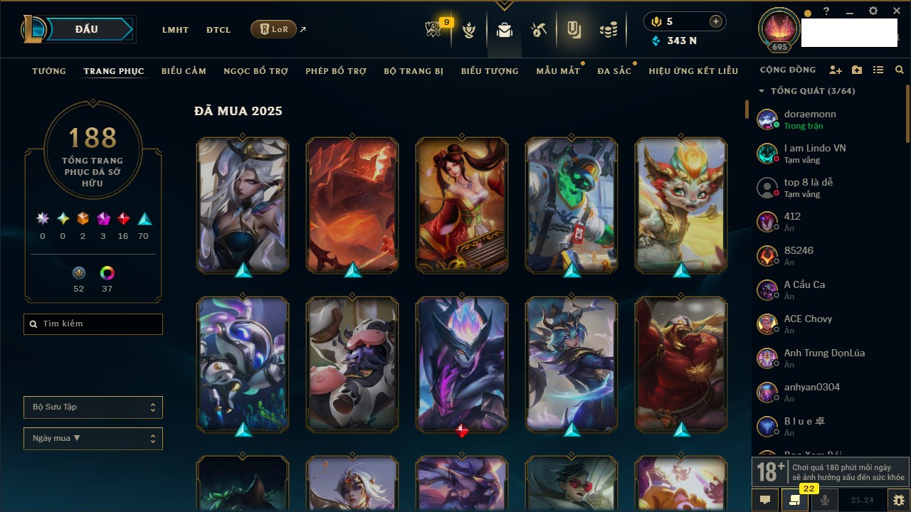 Rank Đơn: Chưa RankKhung: Chưa có khungTướng: 169 - Còn 43188 THXTrang Phục: 205Rank ĐTCL: Chưa RankLinh Thú: 259