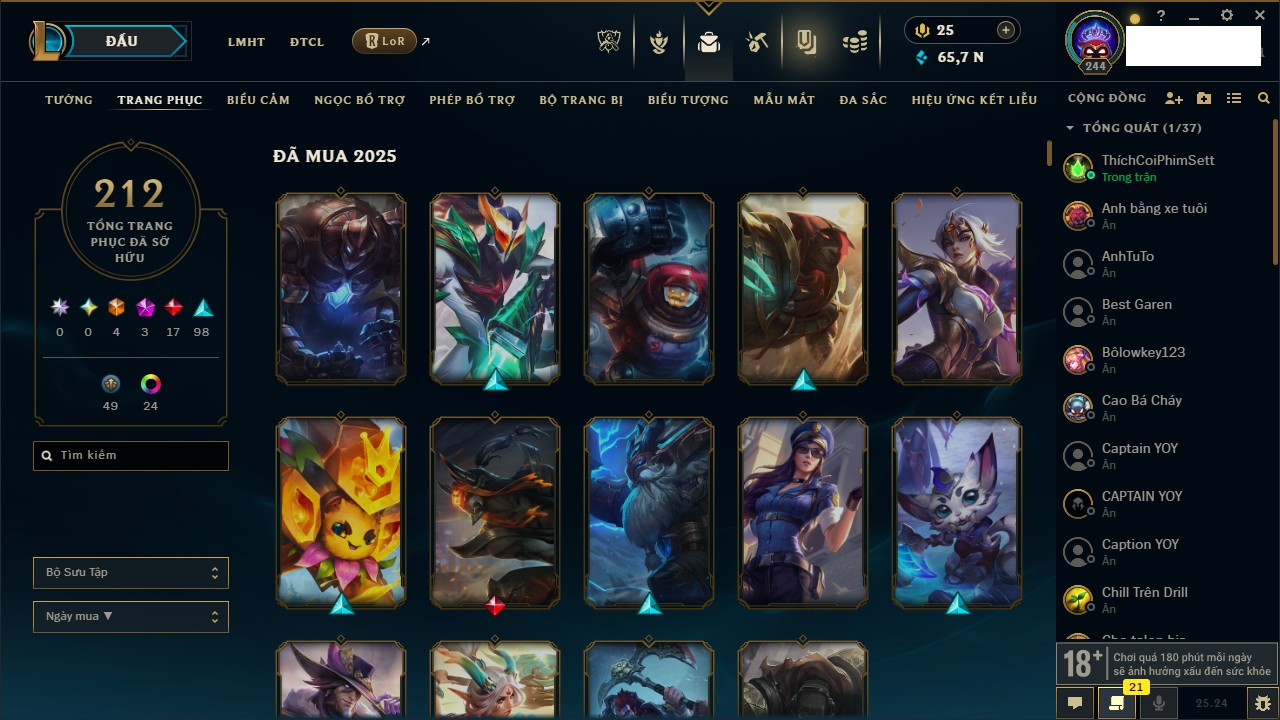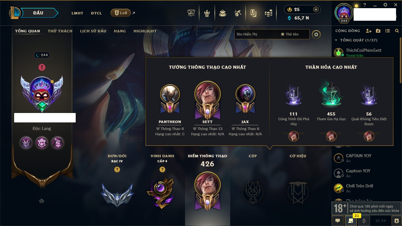 Rank Đơn: Chưa Rank Khung: Chưa có khung Tướng: 172 - Còn 65375 THX Trang Phục: 218 Rank ĐTCL: Chưa Rank Linh Thú: 74
