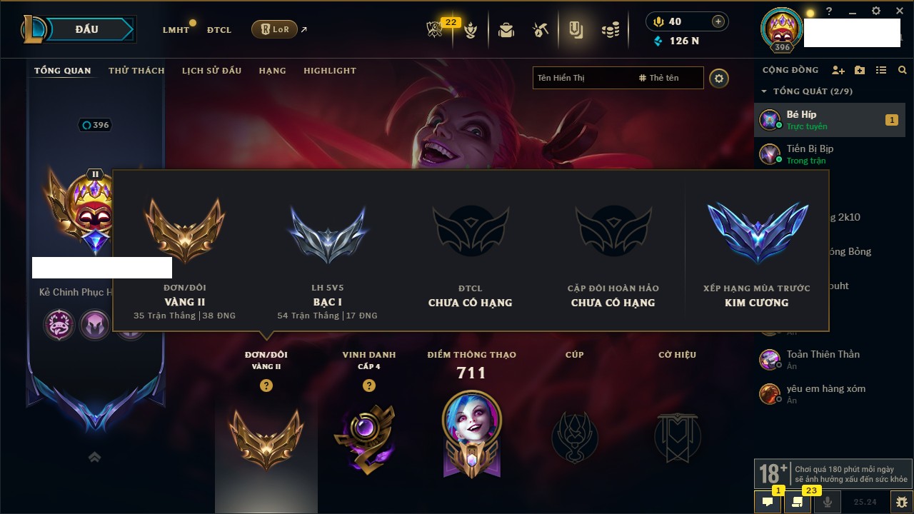 Rank Đơn: Đồng IIKhung: BạcTướng: 163 - Còn 491 THXTrang Phục: 221Rank ĐTCL: Chưa RankLinh Thú: 23