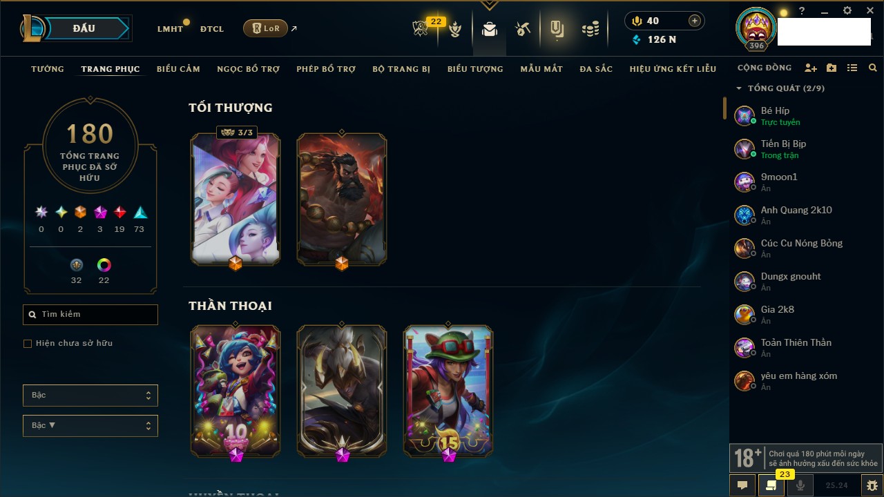 Rank Đơn: Chưa RankKhung: VàngTướng: 171 - Còn 126505 THXTrang Phục: 180Rank ĐTCL: Chưa RankLinh Thú: 198