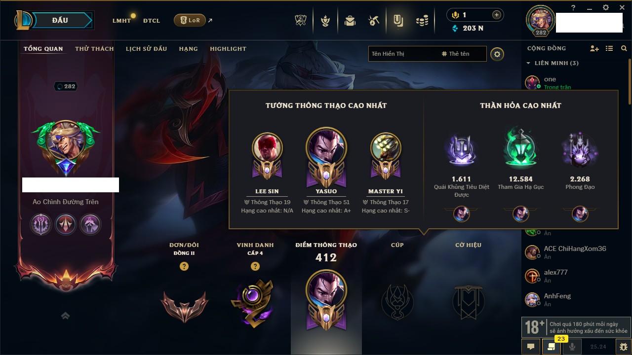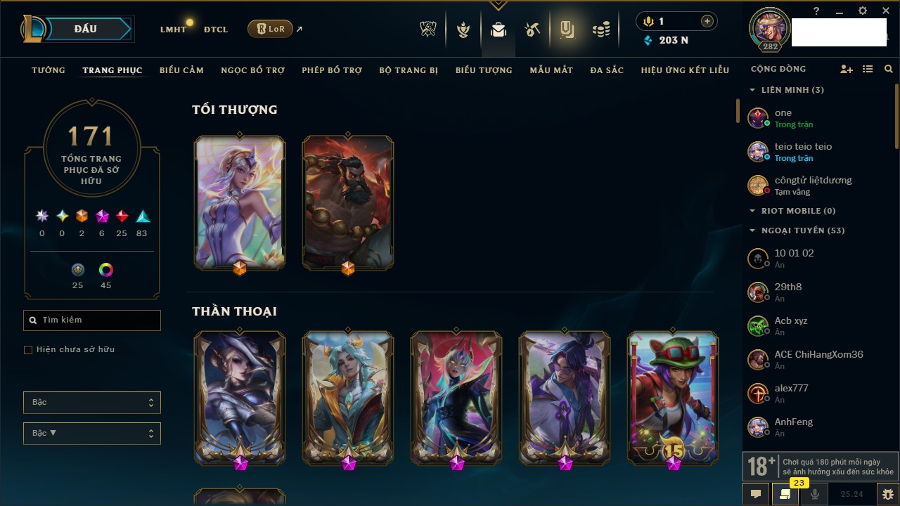 Rank Đơn: Chưa RankKhung: Bạch kimTướng: 171 - Còn 182788 THXTrang Phục: 158Rank ĐTCL: Chưa RankLinh Thú: 56