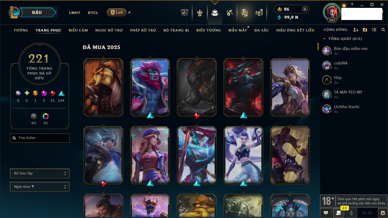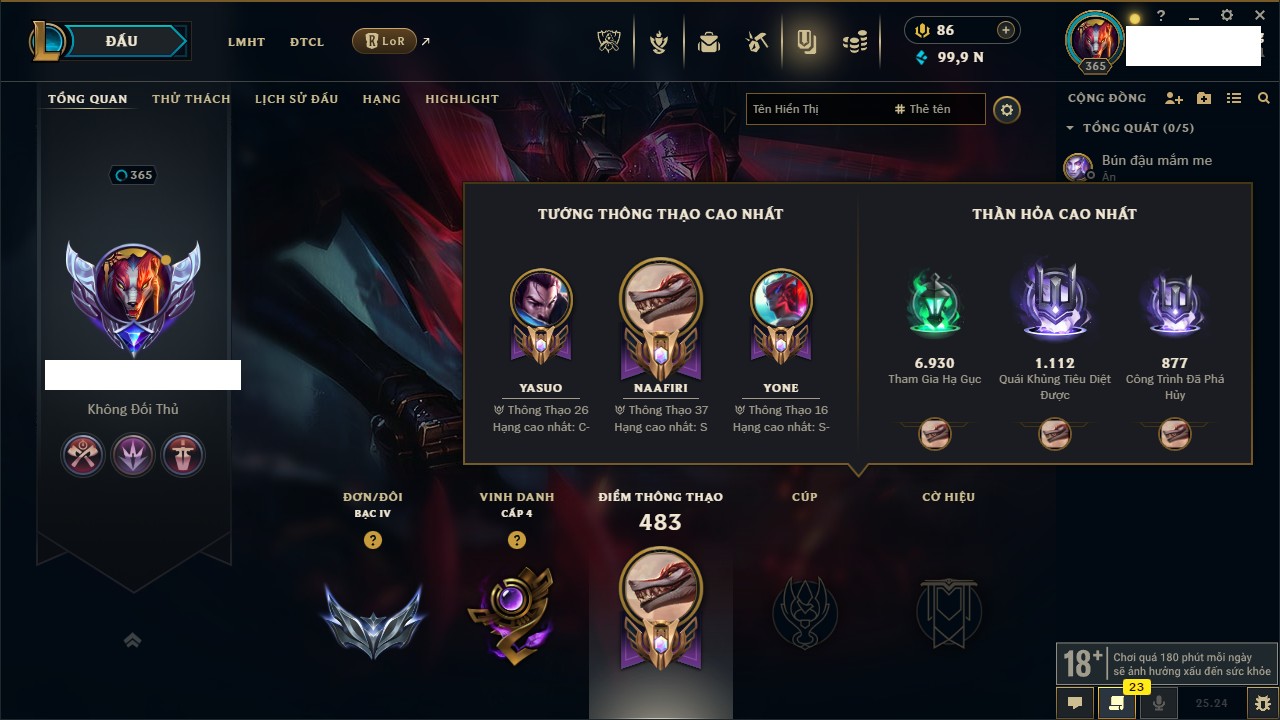 Rank Đơn: Chưa RankKhung: Bạch kimTướng: 172 - Còn 81 THXTrang Phục: 226Rank ĐTCL: Chưa RankLinh Thú: 193