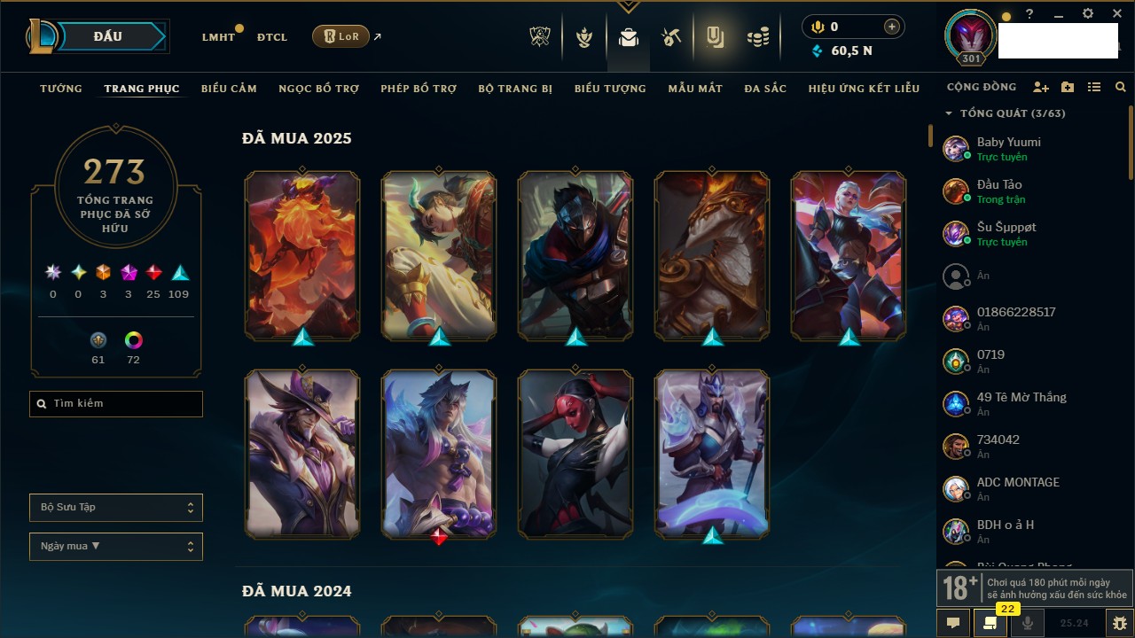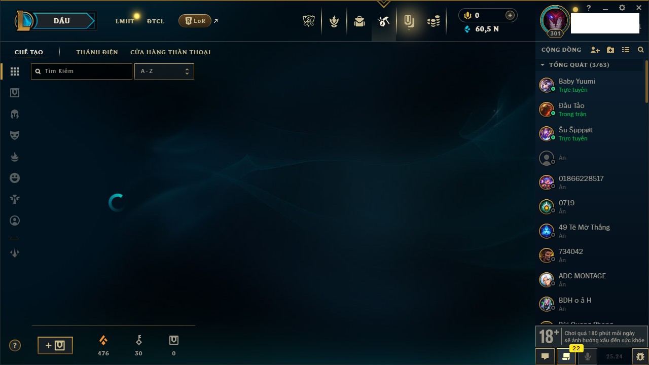Rank Đơn: Chưa RankKhung: BạcTướng: 171 - Còn 60553 THXTrang Phục: 273Rank ĐTCL: Chưa RankLinh Thú: 146