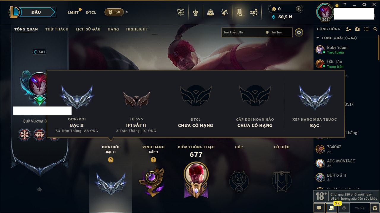 Rank Đơn: Chưa RankKhung: Bạch kimTướng: 86 - Còn 1608 THXTrang Phục: 47Rank ĐTCL: Chưa RankLinh Thú: 58