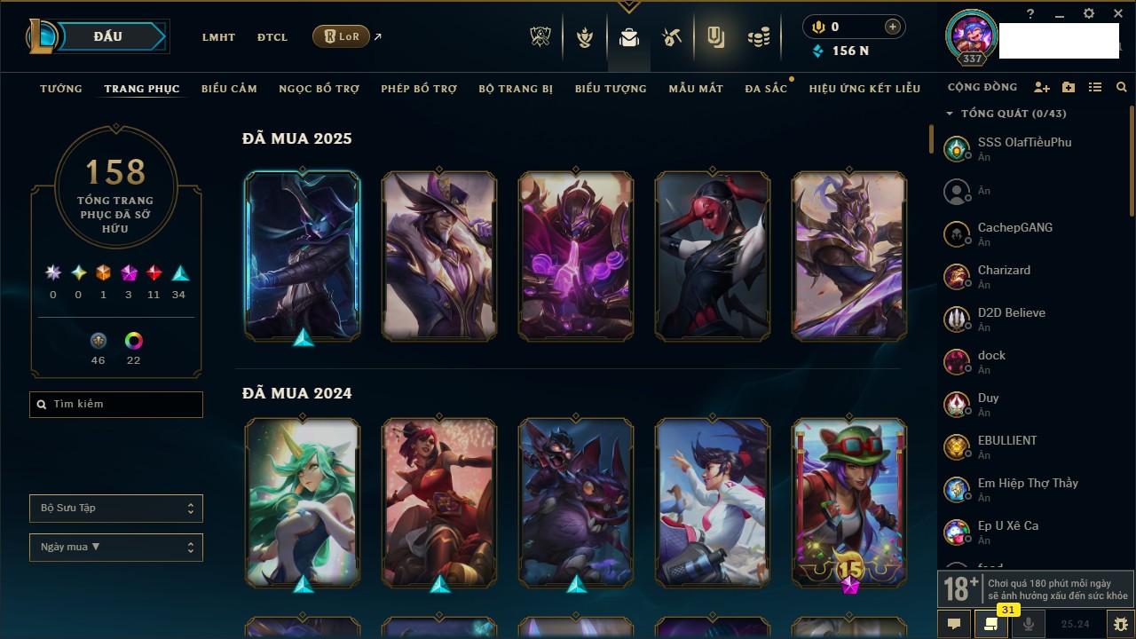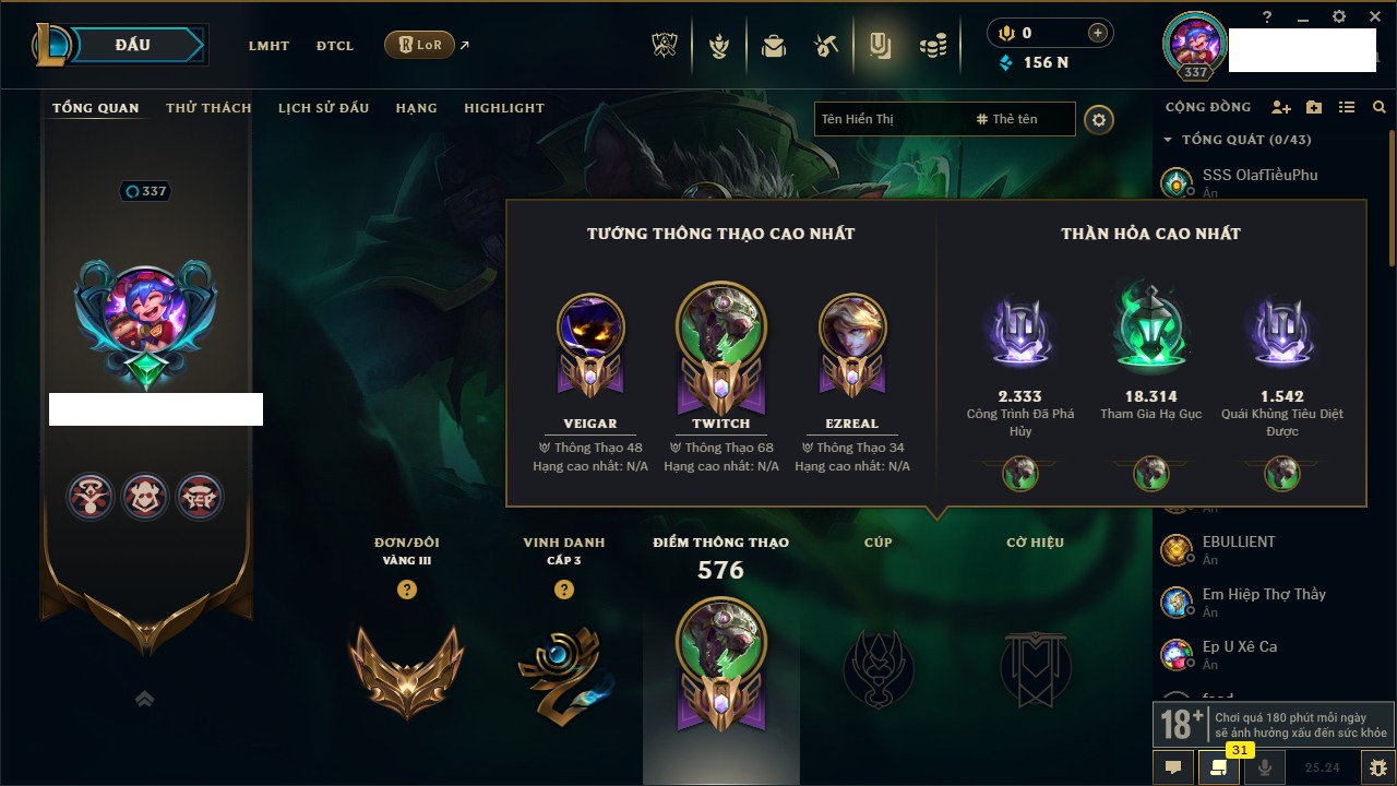 Rank Đơn: Chưa Rank Khung: Vàng Tướng: 171 - Còn 159339 THX Trang Phục: 218 Rank ĐTCL: Chưa Rank Linh Thú: 151
