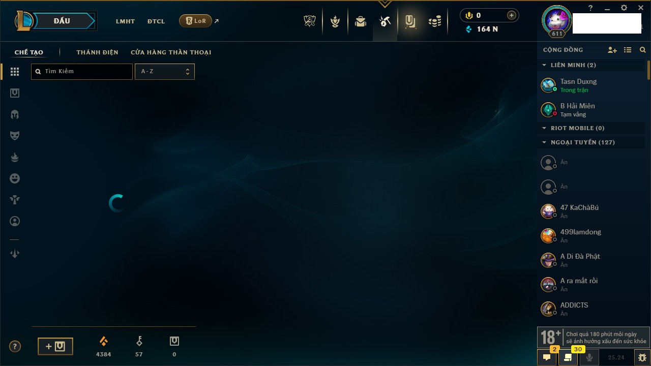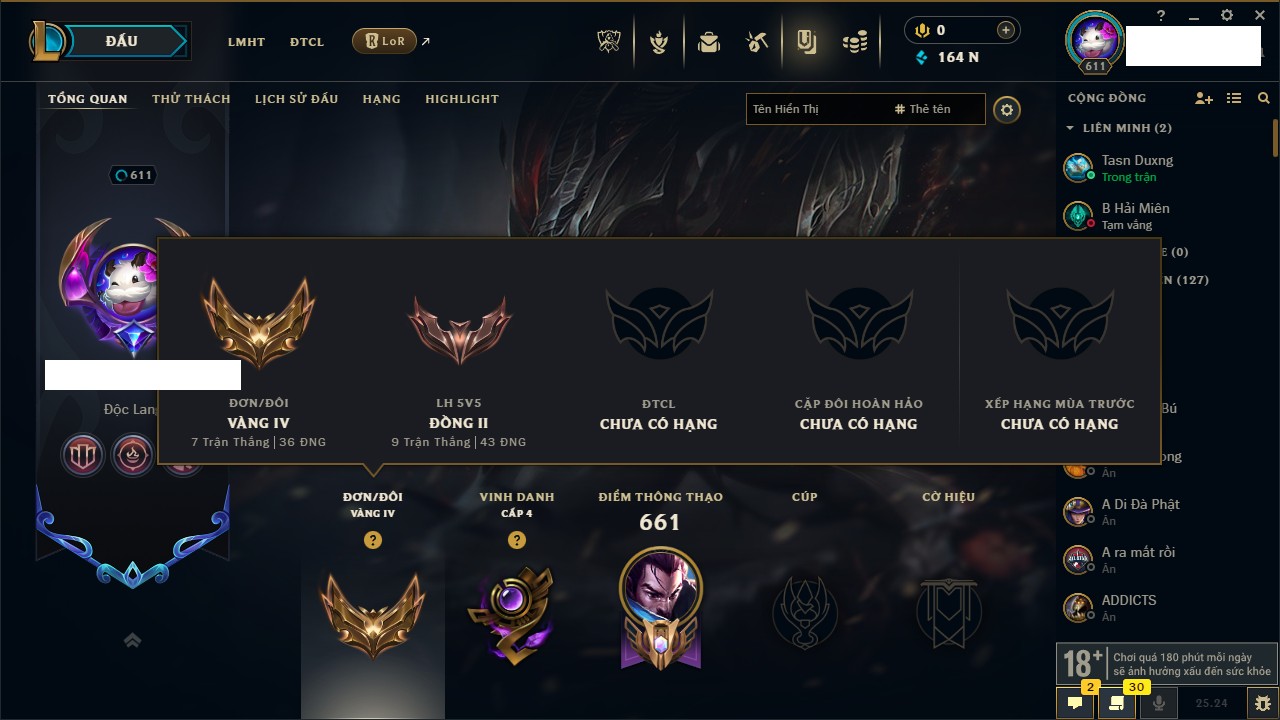 Rank Đơn: Chưa RankKhung: Chưa có khungTướng: 171 - Còn 164047 THXTrang Phục: 173Rank ĐTCL: Chưa RankLinh Thú: 77