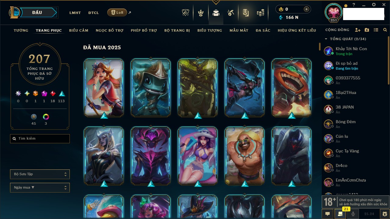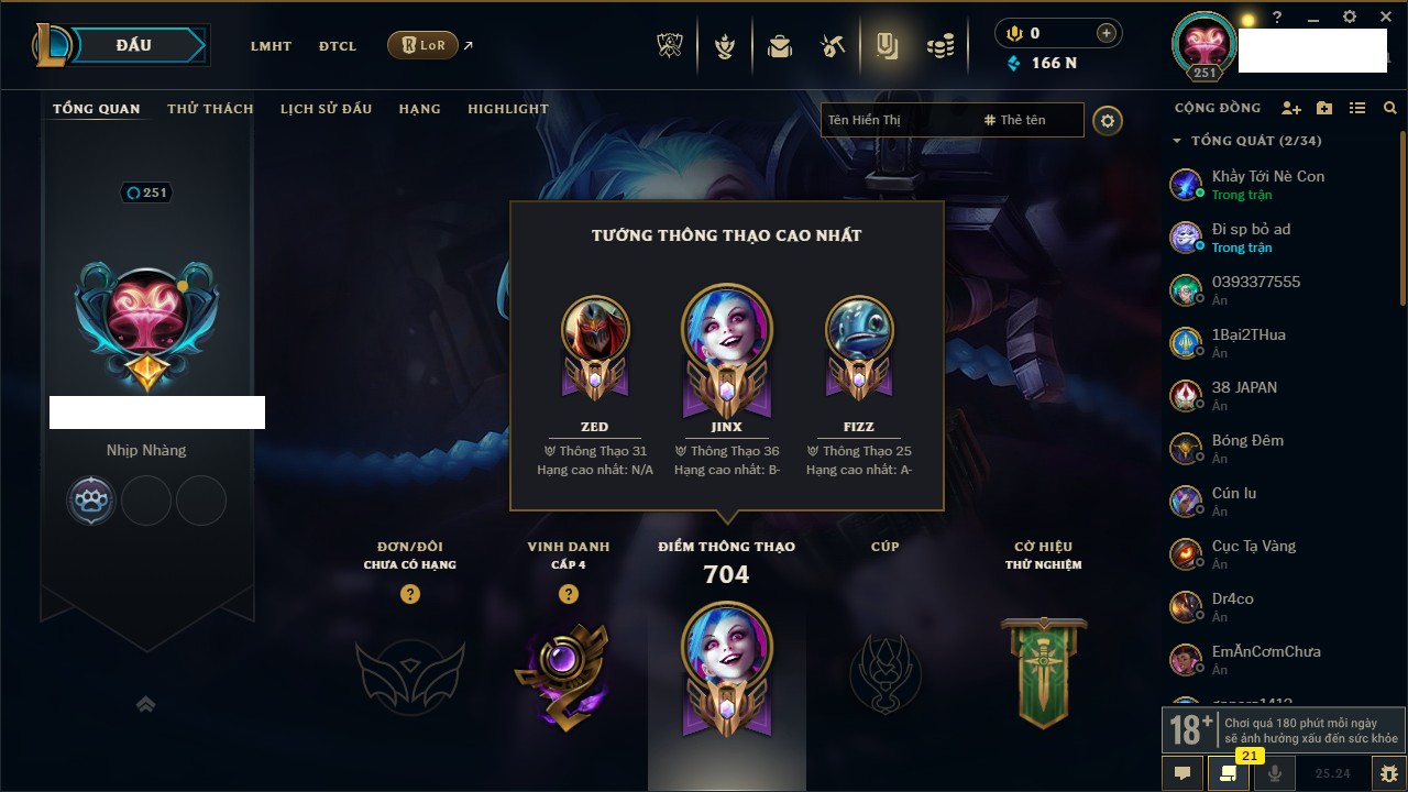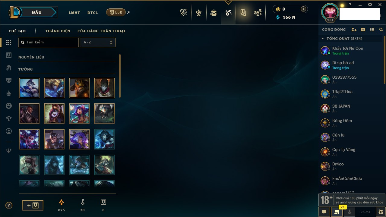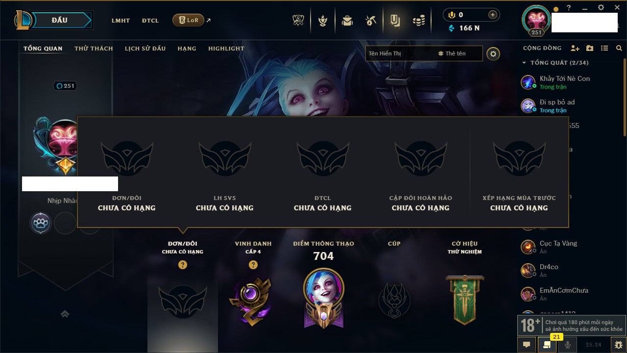 Rank Đơn: Chưa RankKhung: Chưa có khungTướng: 171 - Còn 164047 THXTrang Phục: 173Rank ĐTCL: Chưa RankLinh Thú: 77