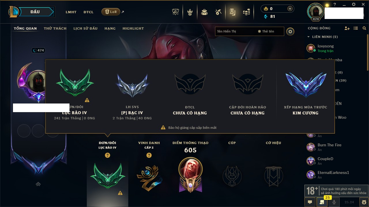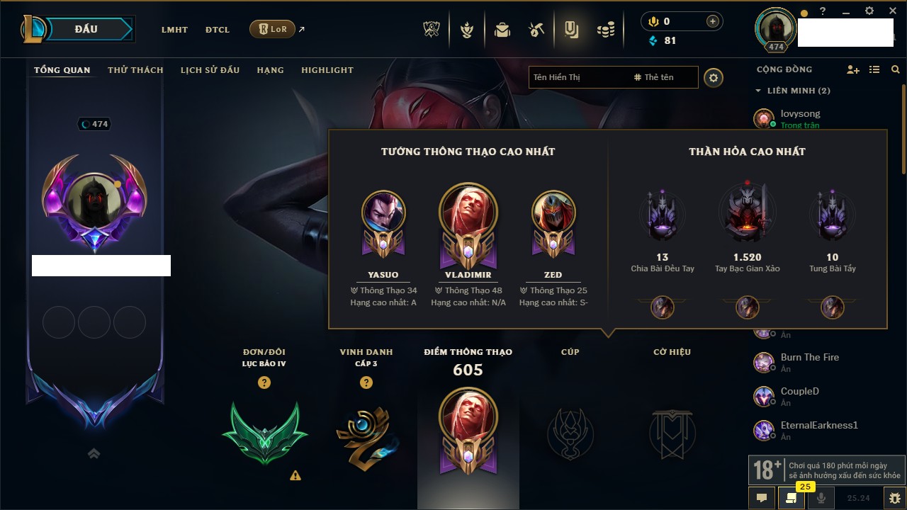 Rank Đơn: Chưa RankKhung: Bạch kimTướng: 172 - Còn 81 THXTrang Phục: 226Rank ĐTCL: Chưa RankLinh Thú: 193