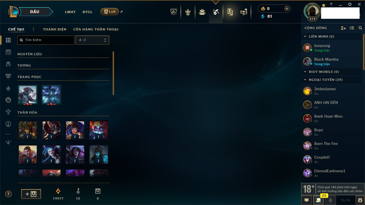 Rank Đơn: Chưa RankKhung: VàngTướng: 171 - Còn 489498 THXTrang Phục: 263Rank ĐTCL: Chưa RankLinh Thú: 39