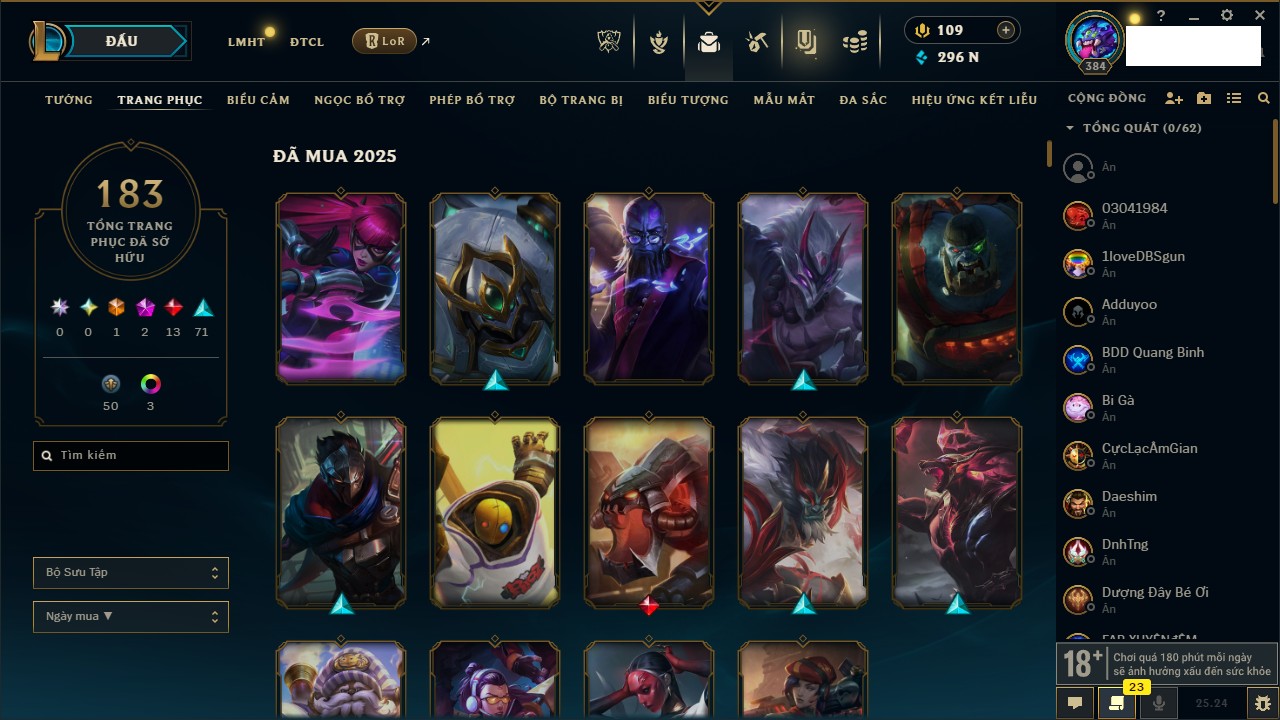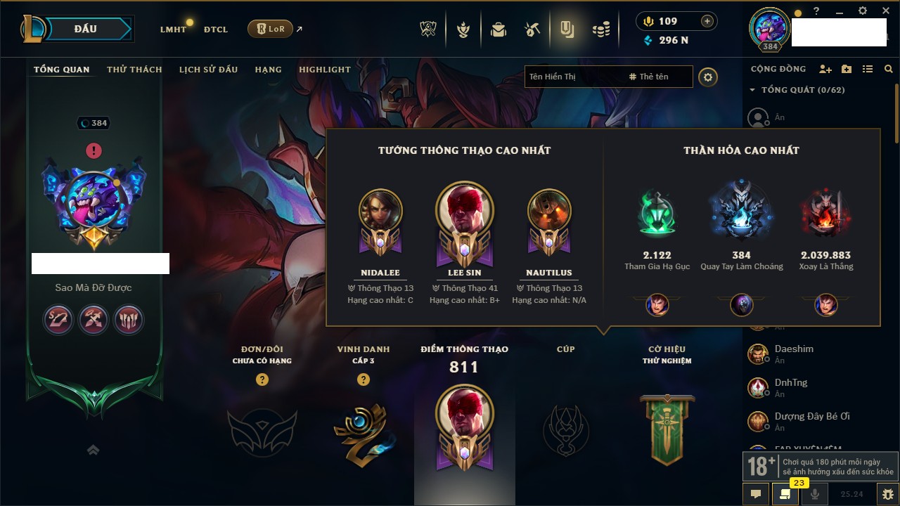 Rank Đơn: Chưa Rank Khung: Chưa có khung Tướng: 171 - Còn 52162 THX Trang Phục: 78 Rank ĐTCL: Chưa Rank Linh Thú: 145