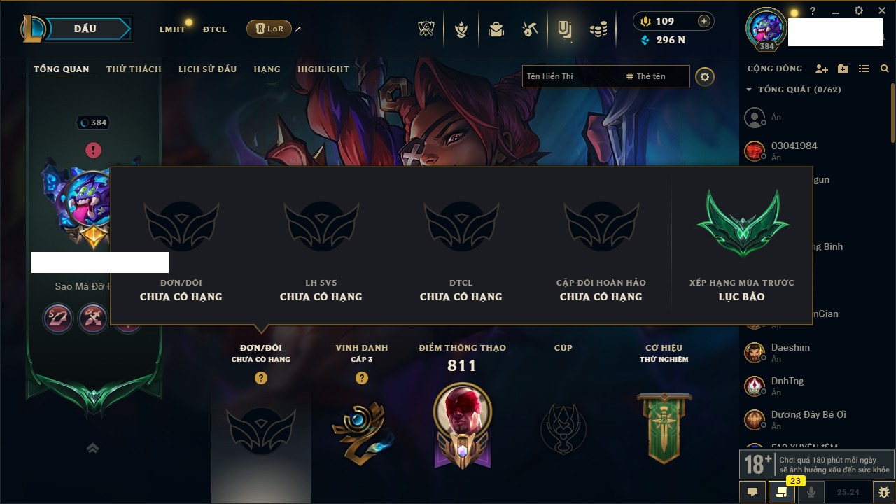 Rank Đơn: Chưa Rank Khung: Chưa có khung Tướng: 157 - Còn 51905 THX Trang Phục: 3 Rank ĐTCL: Chưa Rank Linh Thú: 175