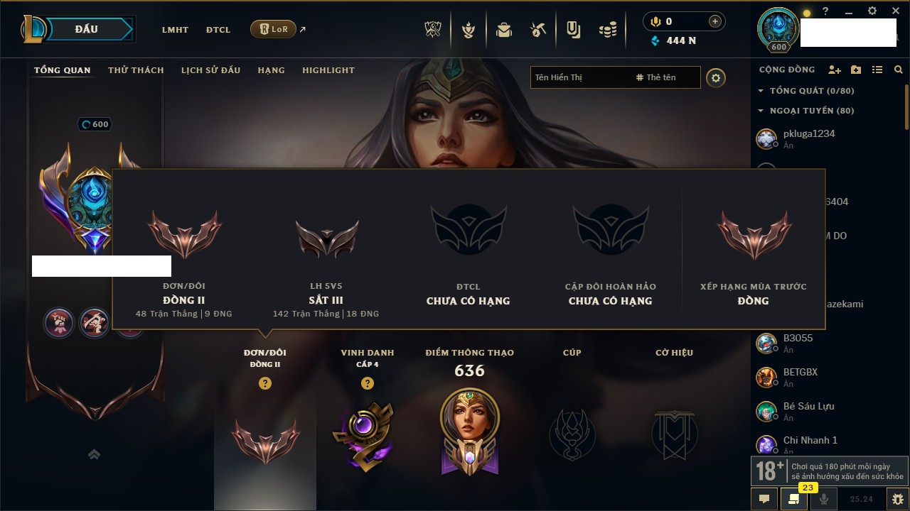 Rank Đơn: Chưa RankKhung: Chưa có khungTướng: 160 - Còn 21398 THXTrang Phục: 380Rank ĐTCL: Chưa RankLinh Thú: 27
