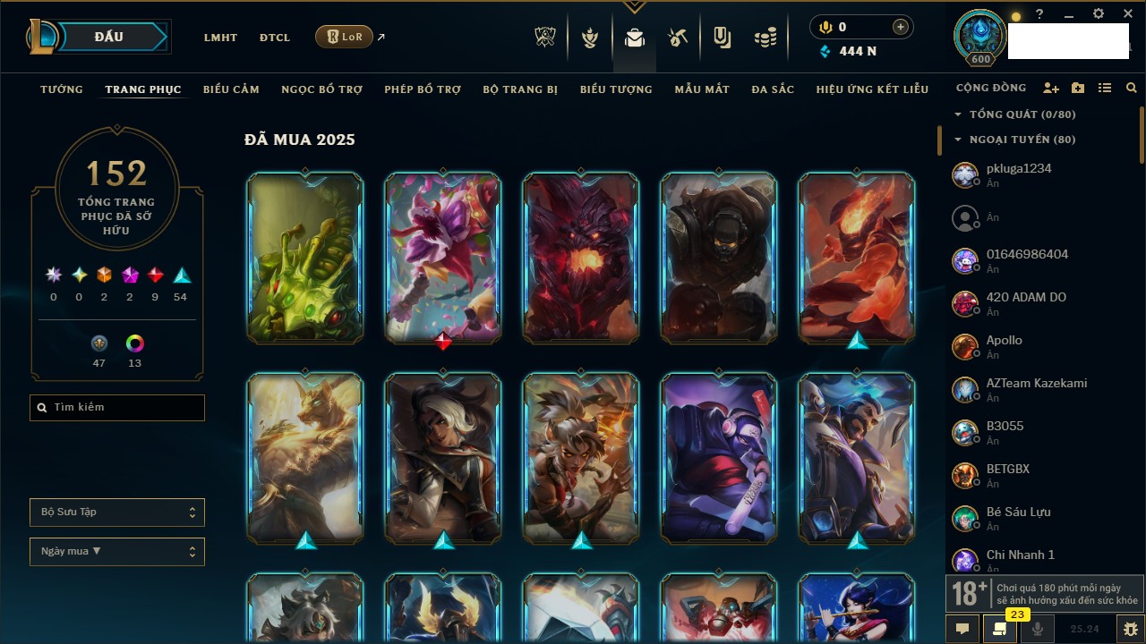 Rank Đơn: Chưa RankKhung: Chưa có khungTướng: 171 - Còn 75227 THXTrang Phục: 425Rank ĐTCL: Chưa RankLinh Thú: 201