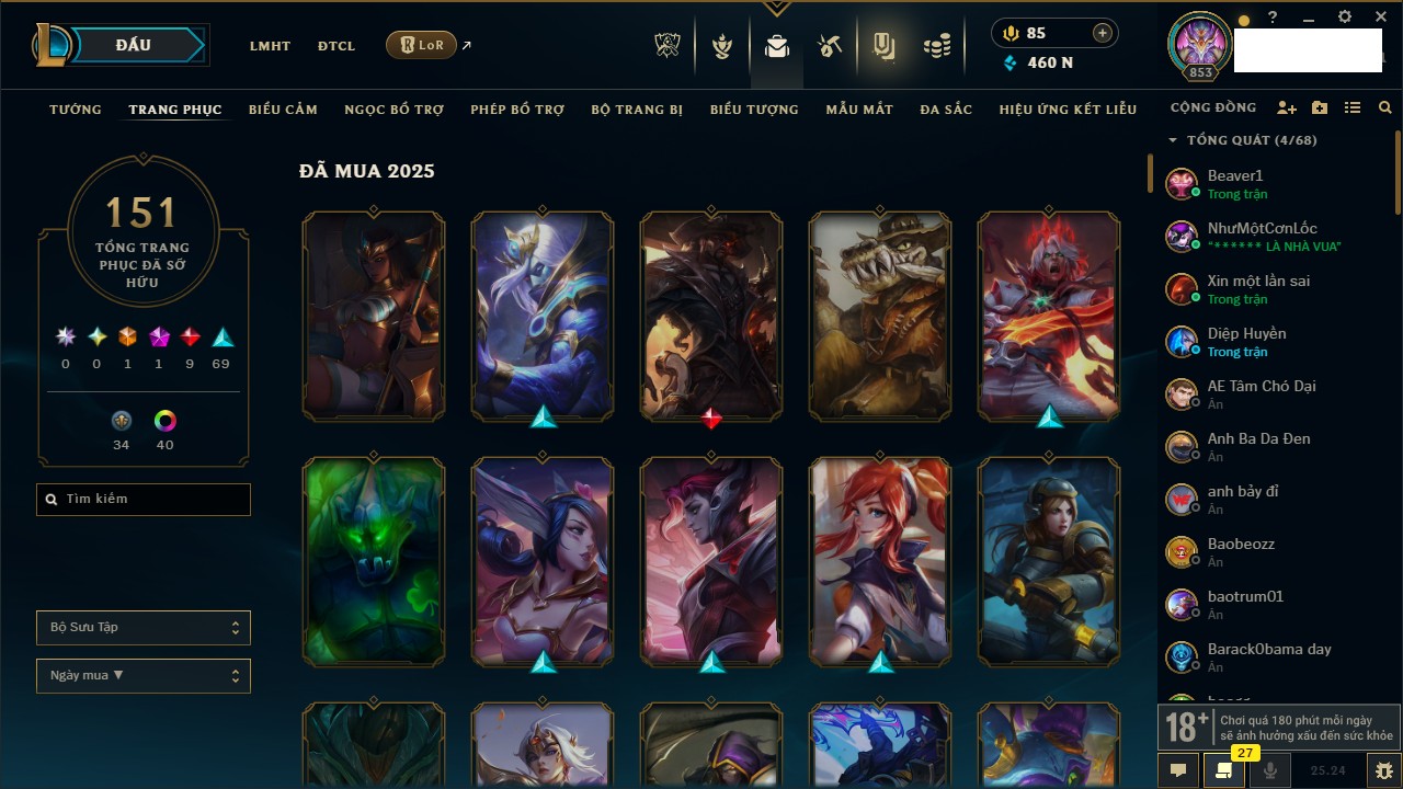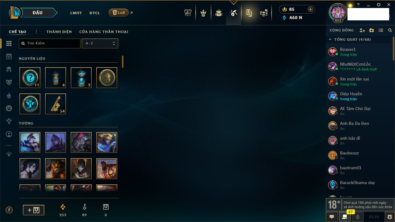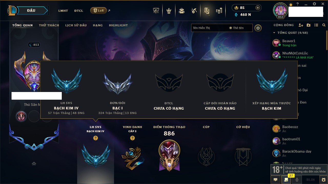 Rank Đơn: Chưa RankKhung: Bạch kimTướng: 172 - Còn 11167 THXTrang Phục: 460Rank ĐTCL: Chưa RankLinh Thú: 93