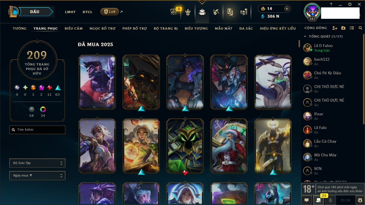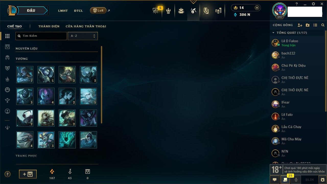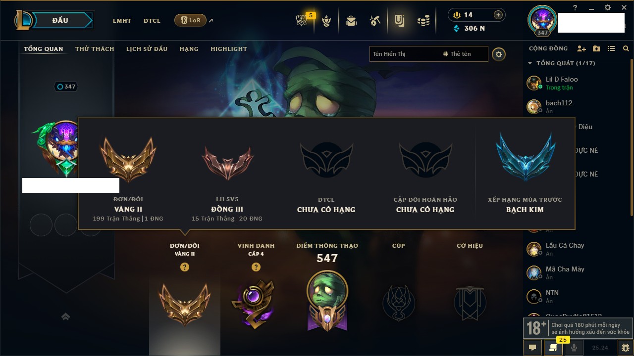 Rank Đơn: Chưa RankKhung: Chưa có khungTướng: 171 - Còn 75227 THXTrang Phục: 425Rank ĐTCL: Chưa RankLinh Thú: 201