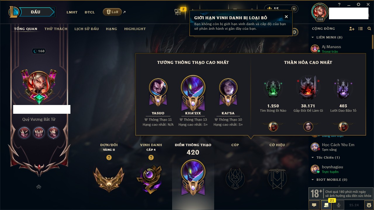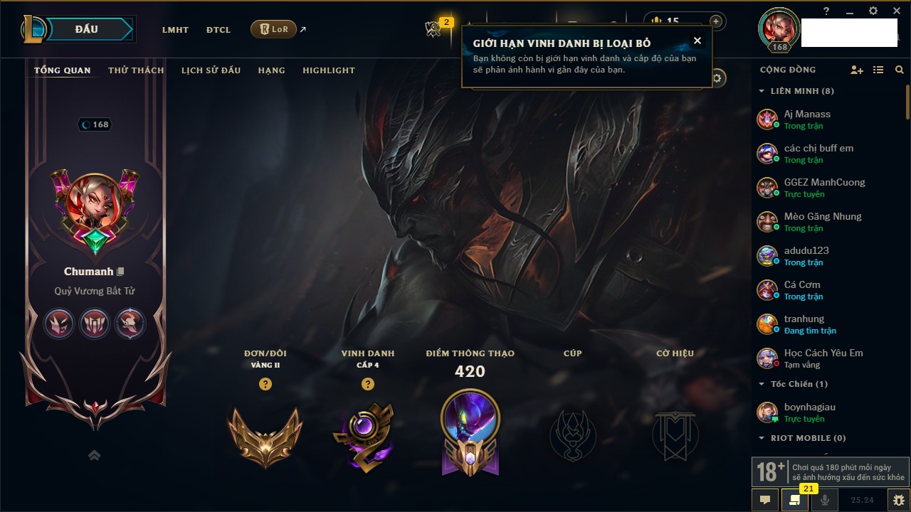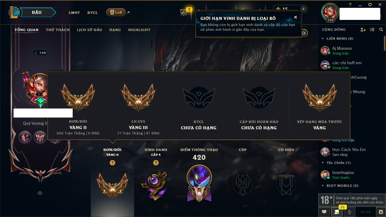 Rank Đơn: Chưa Rank Khung: Bạch kim Tướng: 171 - Còn 1712 THX Trang Phục: 168 Rank ĐTCL: Chưa Rank Linh Thú: 53