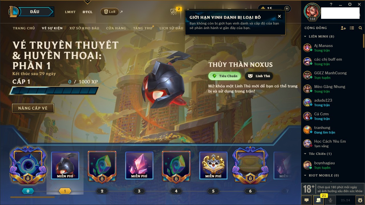 Rank Đơn: Chưa Rank Khung: Vàng Tướng: 172 - Còn 200315 THX Trang Phục: 87 Rank ĐTCL: Chưa Rank Linh Thú: 136