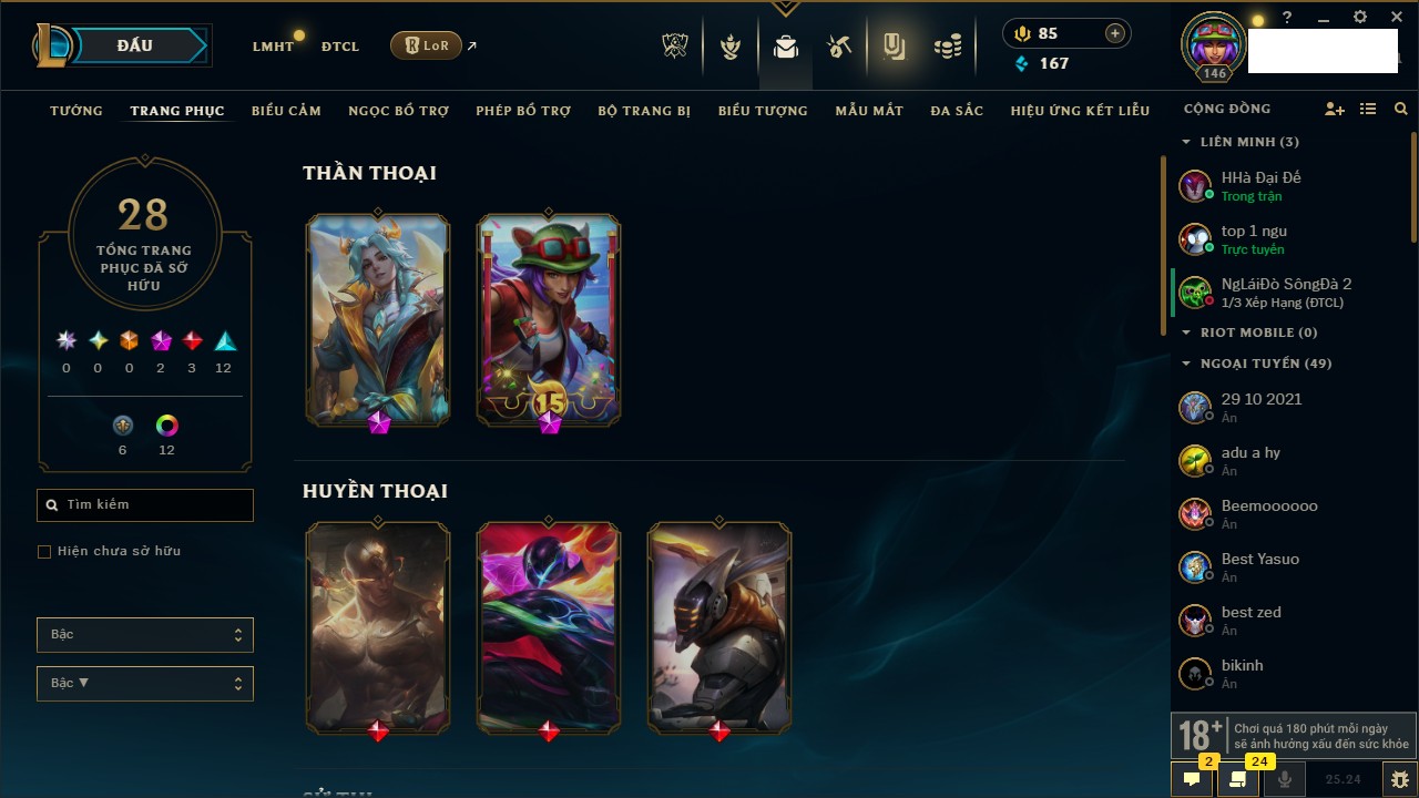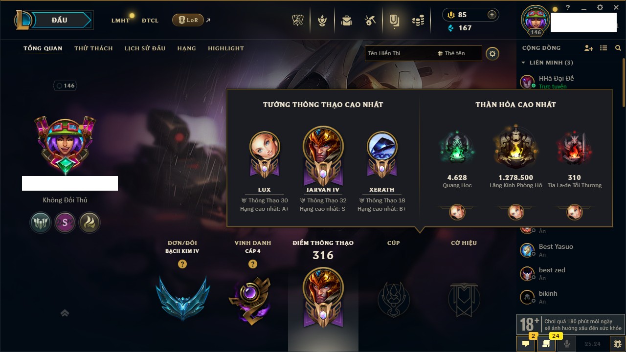 Rank Đơn: Chưa Rank Khung: Vàng Tướng: 171 - Còn 159339 THX Trang Phục: 218 Rank ĐTCL: Chưa Rank Linh Thú: 151