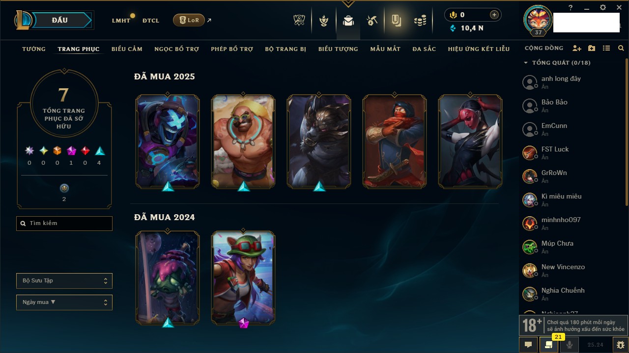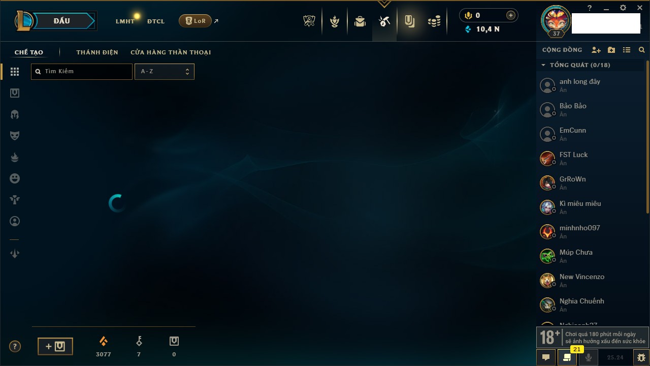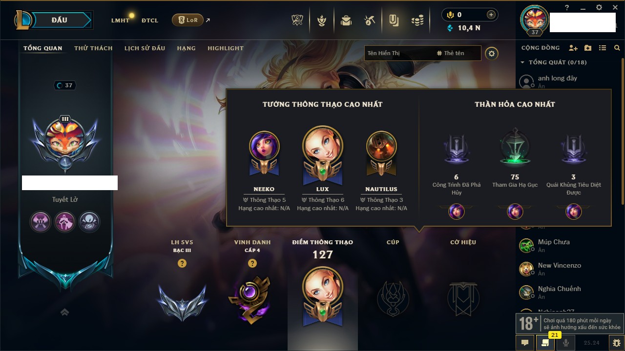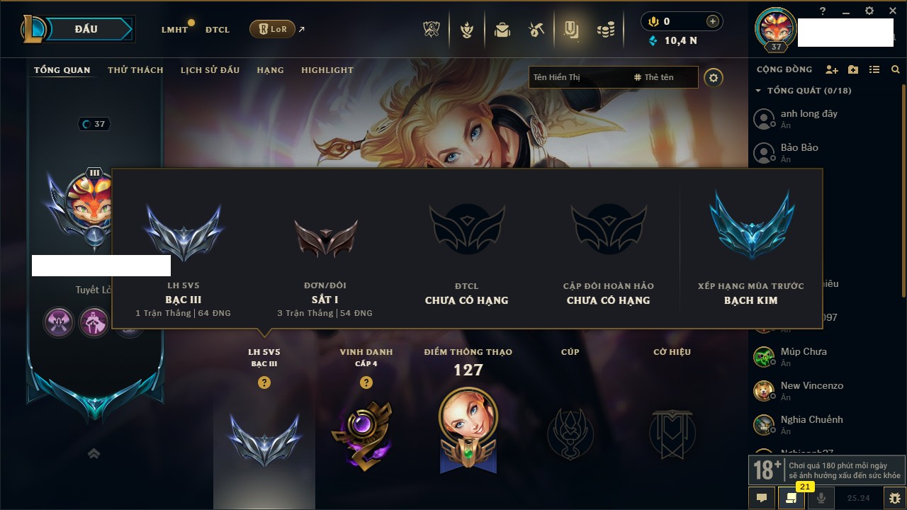 Rank Đơn: Chưa Rank Khung: Bạch kim Tướng: 145 - Còn 9448 THX Trang Phục: 62 Rank ĐTCL: Chưa Rank Linh Thú: 130