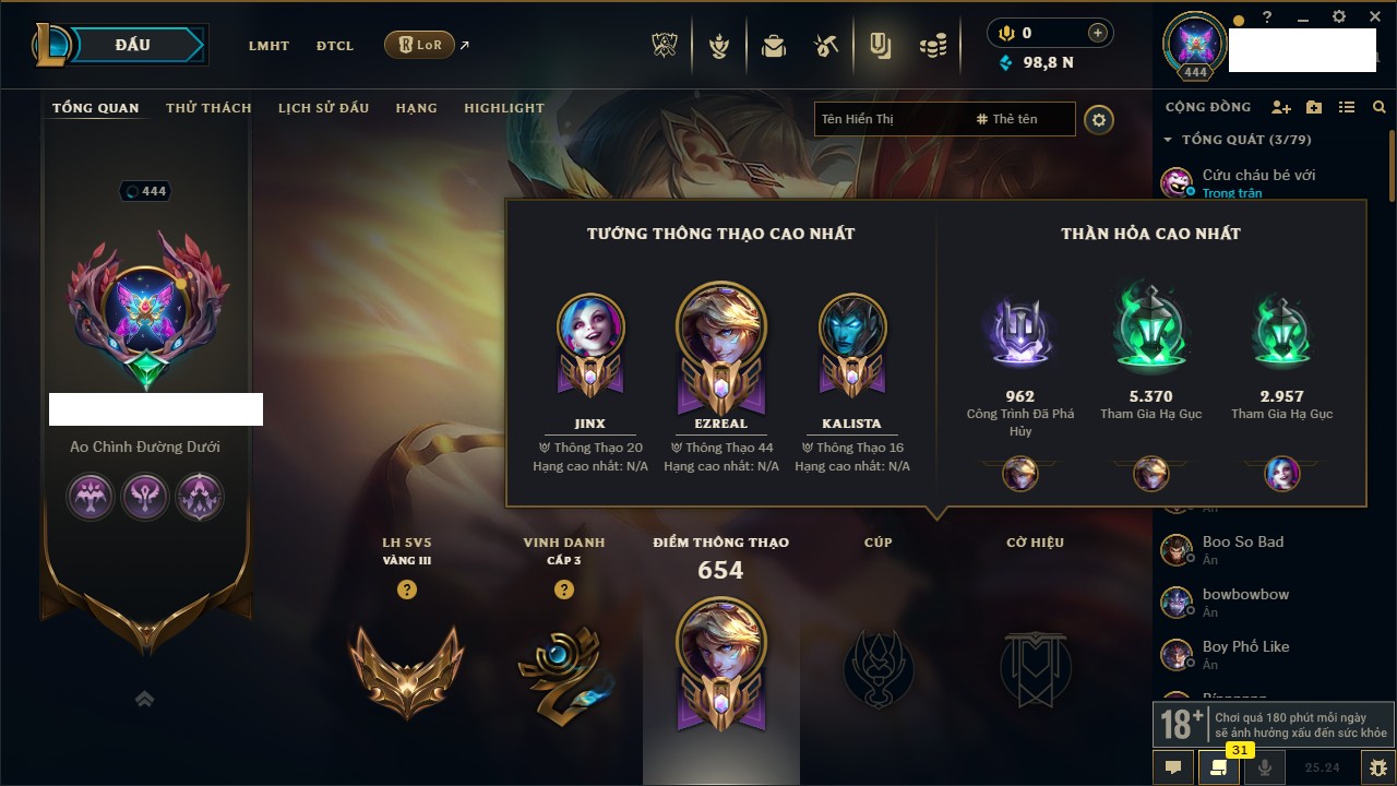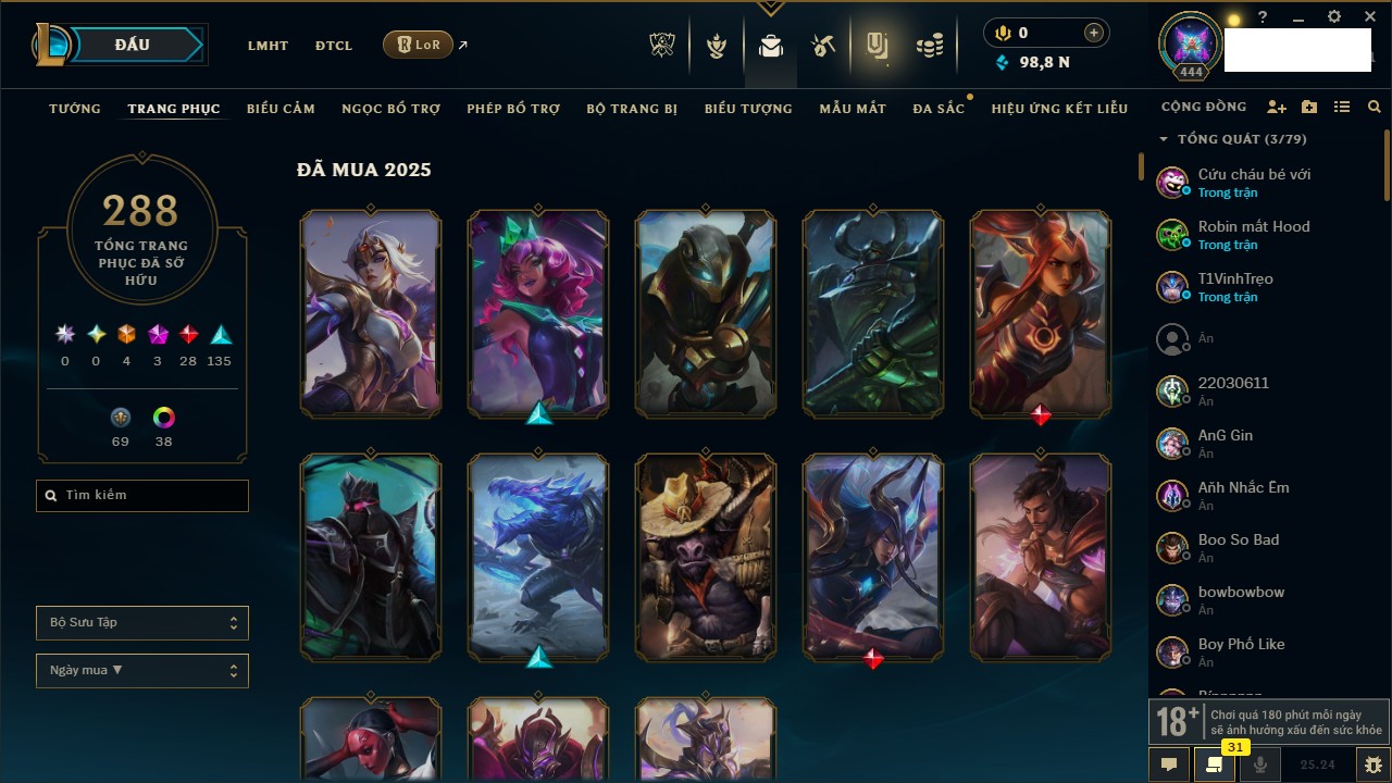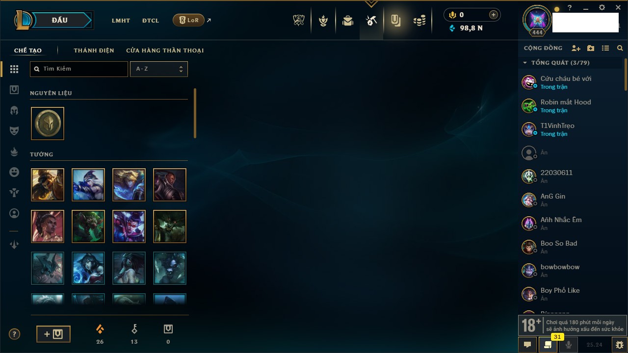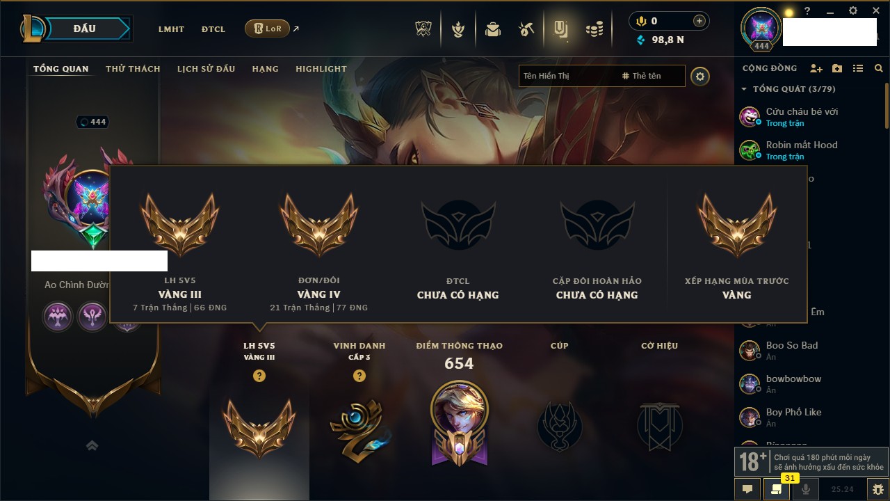Rank Đơn: Chưa RankKhung: Chưa có khungTướng: 171 - Còn 75227 THXTrang Phục: 425Rank ĐTCL: Chưa RankLinh Thú: 201