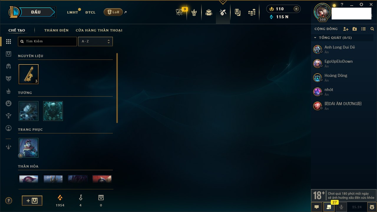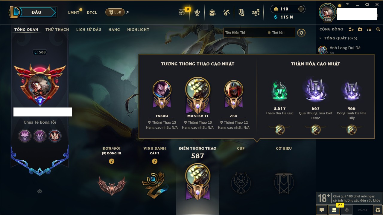 Rank Đơn: Chưa RankKhung: Bạch kimTướng: 172 - Còn 867 THXTrang Phục: 242Rank ĐTCL: Chưa RankLinh Thú: 162