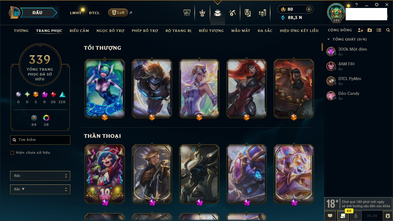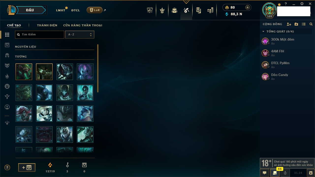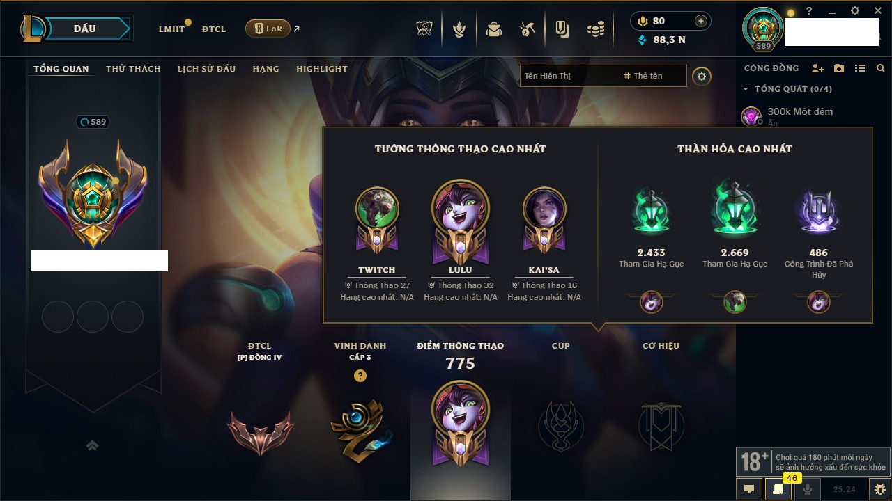 Rank Đơn: Chưa RankKhung: Chưa có khungTướng: 171 - Còn 75227 THXTrang Phục: 425Rank ĐTCL: Chưa RankLinh Thú: 201