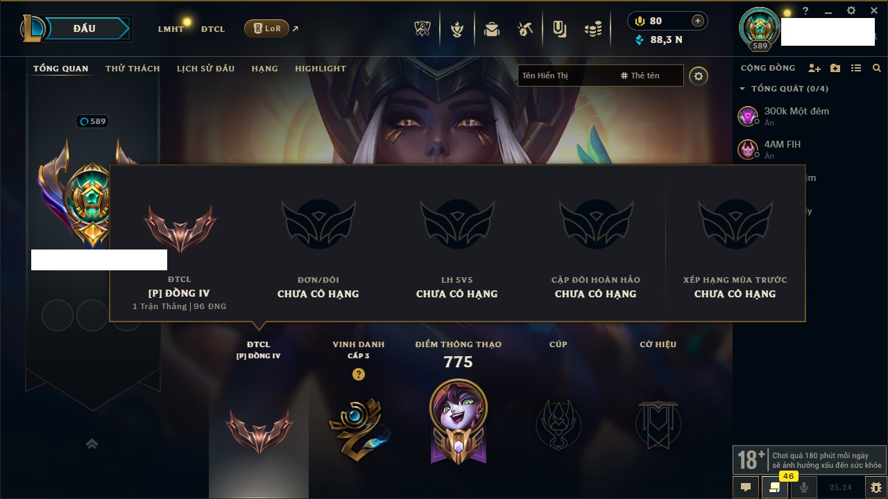 Rank Đơn: Chưa RankKhung: VàngTướng: 171 - Còn 207237 THXTrang Phục: 125Rank ĐTCL: Chưa RankLinh Thú: 112