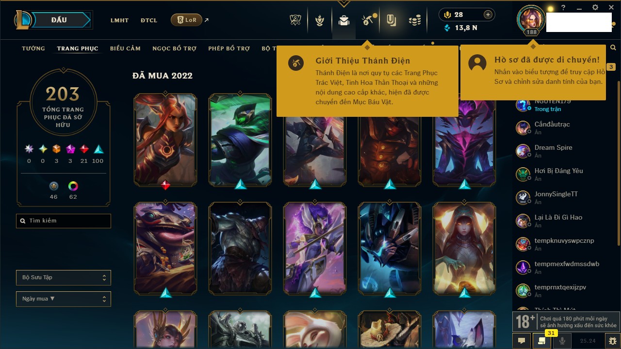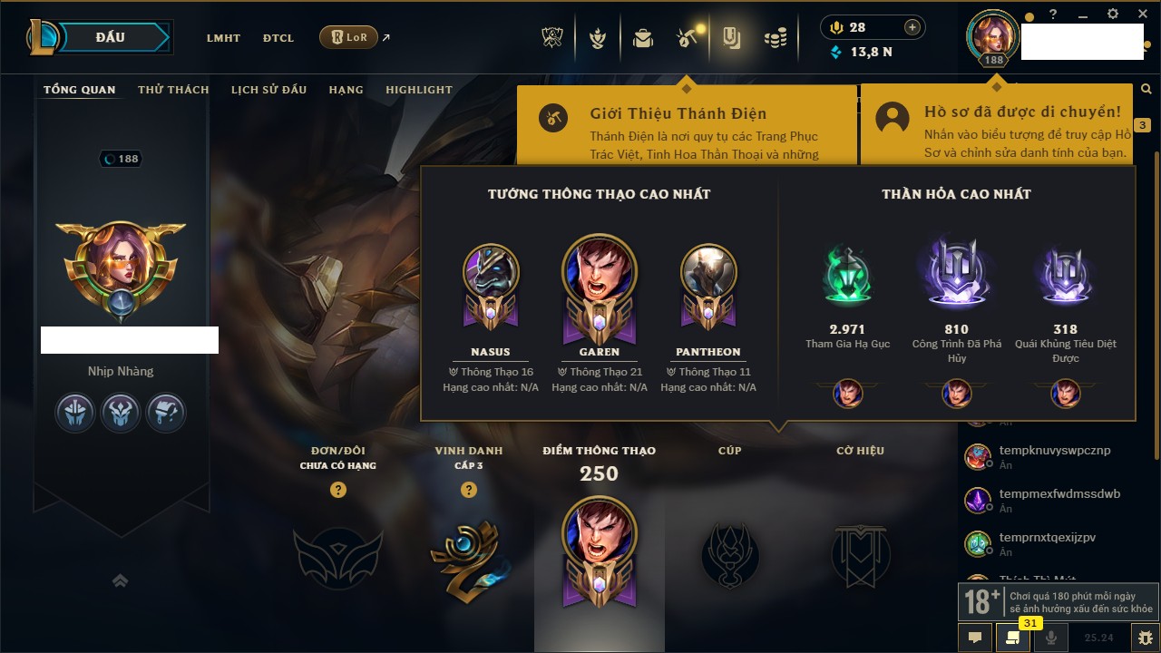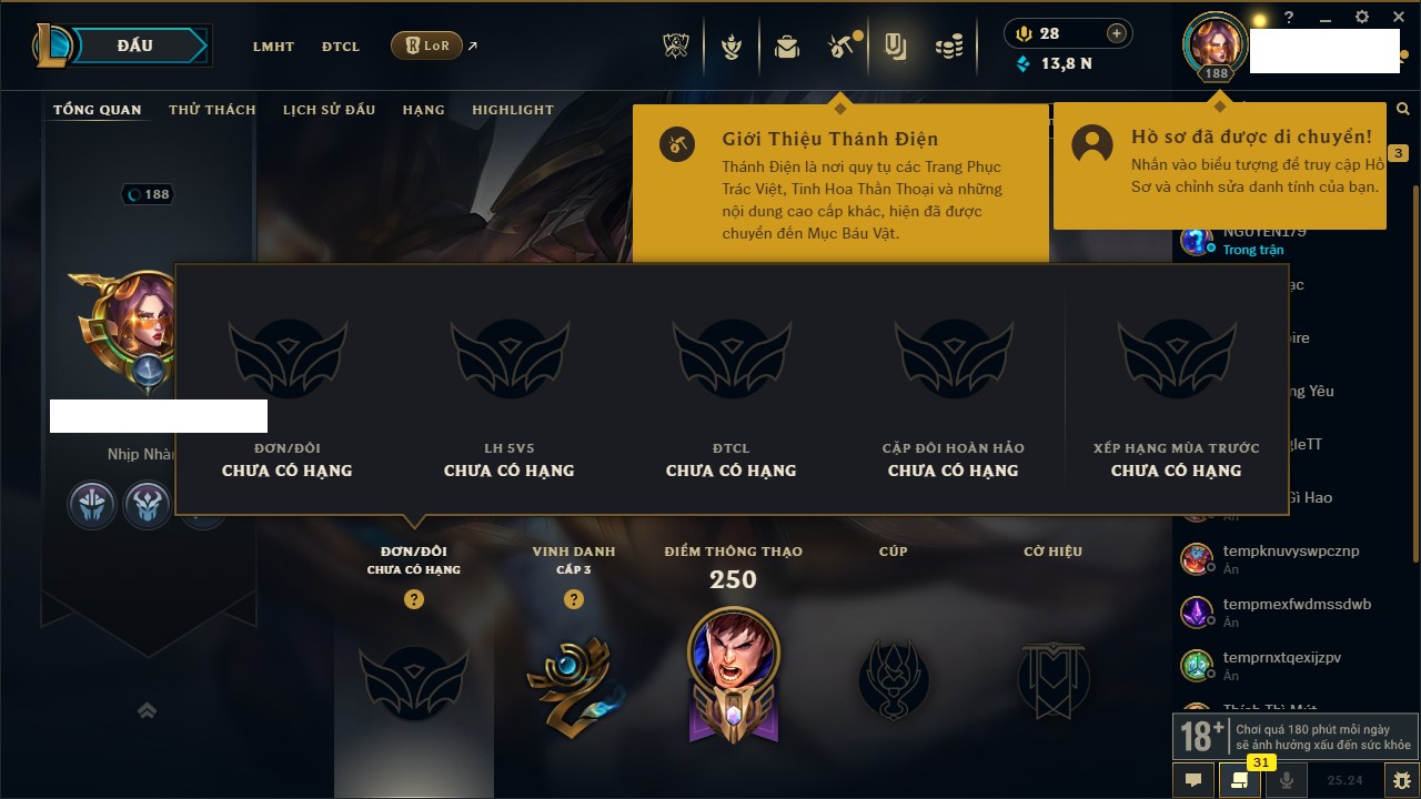 Rank Đơn: Chưa RankKhung: VàngTướng: 171 - Còn 660284 THXTrang Phục: 199Rank ĐTCL: Chưa RankLinh Thú: 34