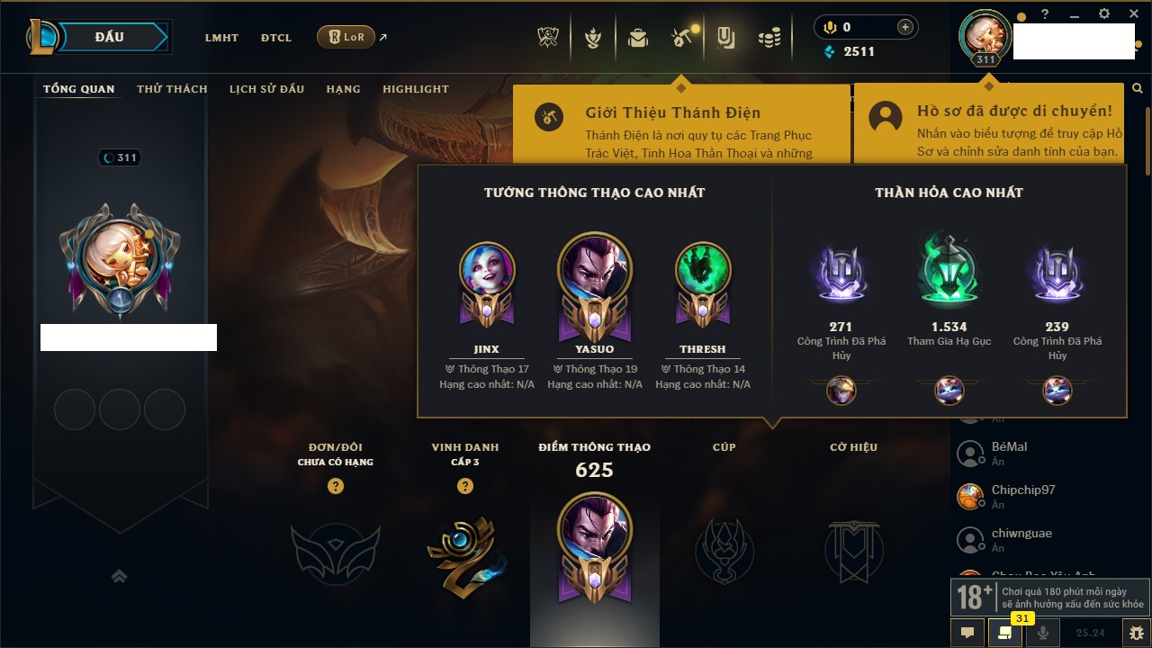 Rank Đơn: Chưa RankKhung: Bạch kimTướng: 172 - Còn 867 THXTrang Phục: 242Rank ĐTCL: Chưa RankLinh Thú: 162