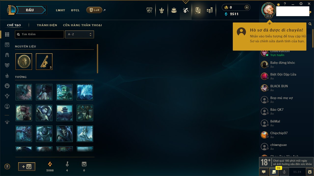 Rank Đơn: Chưa RankKhung: Bạch kimTướng: 168 - Còn 83003 THXTrang Phục: 210Rank ĐTCL: Chưa RankLinh Thú: 36