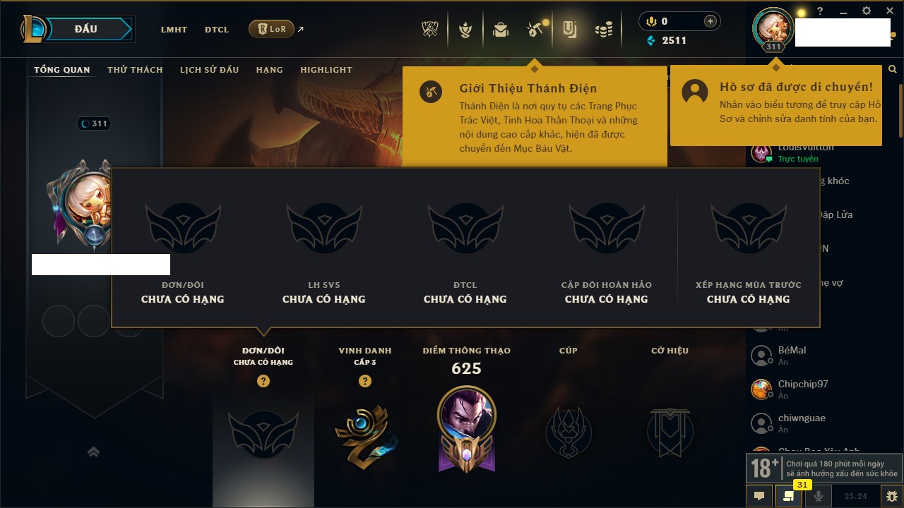 Rank Đơn: Chưa RankKhung: VàngTướng: 171 - Còn 130578 THXTrang Phục: 253Rank ĐTCL: Chưa RankLinh Thú: 20