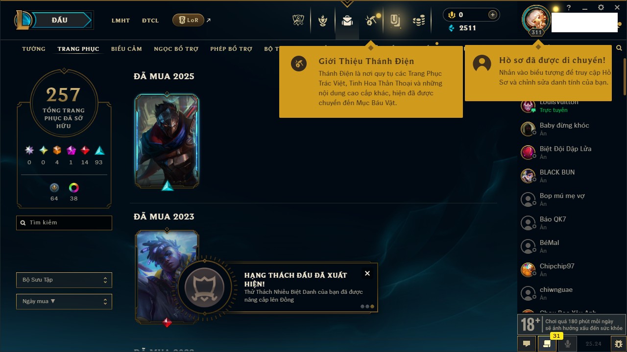 Rank Đơn: Chưa RankKhung: VàngTướng: 171 - Còn 97205 THXTrang Phục: 248Rank ĐTCL: Chưa RankLinh Thú: 118