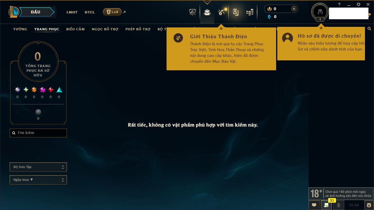 Rank Đơn: Chưa Rank Khung: Đồng Tướng: 145 - Còn 4341 THX Trang Phục: 30 Rank ĐTCL: Chưa Rank Linh Thú: 82