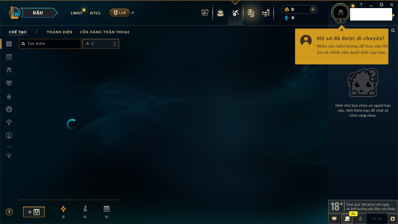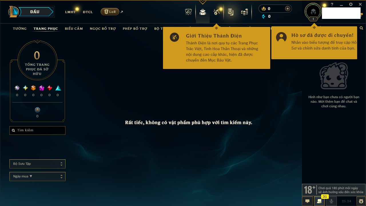 Rank Đơn: Chưa Rank Khung: Chưa có khung Tướng: 157 - Còn 51905 THX Trang Phục: 3 Rank ĐTCL: Chưa Rank Linh Thú: 175