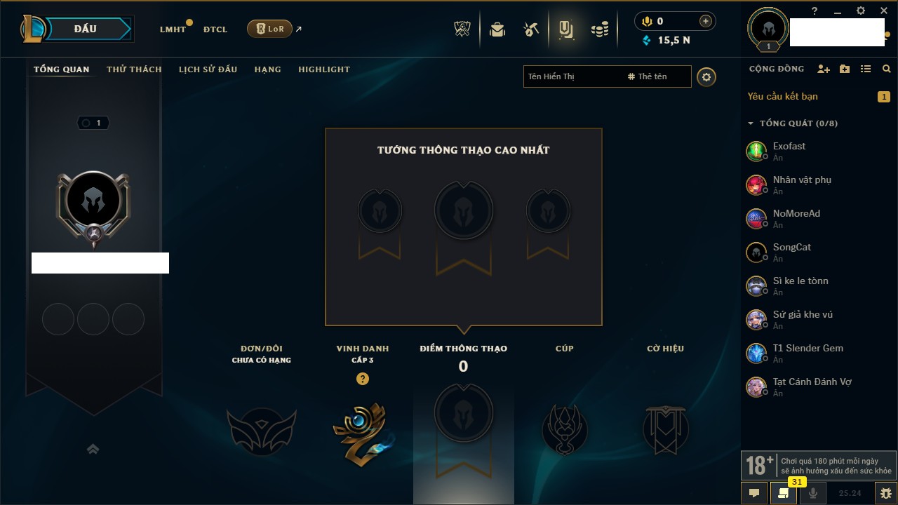 Rank Đơn: Chưa Rank Khung: Đồng Tướng: 145 - Còn 4341 THX Trang Phục: 30 Rank ĐTCL: Chưa Rank Linh Thú: 82