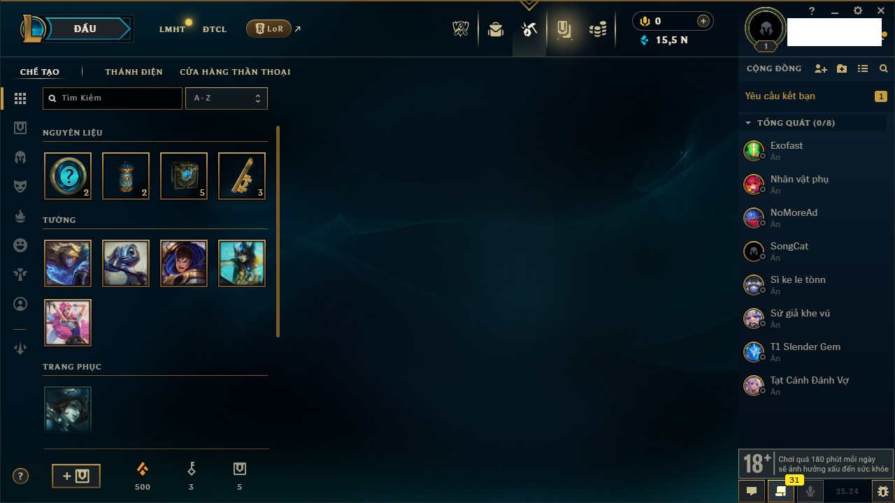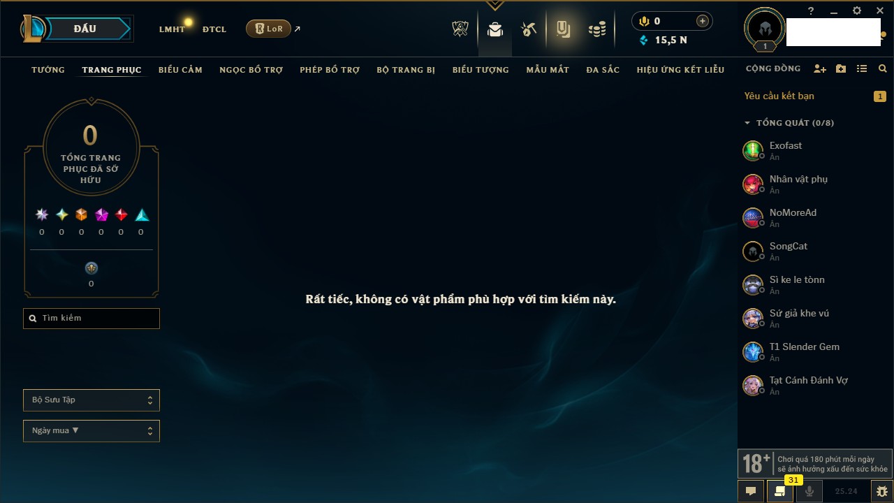 Rank Đơn: Chưa Rank Khung: Chưa có khung Tướng: 171 - Còn 52162 THX Trang Phục: 78 Rank ĐTCL: Chưa Rank Linh Thú: 145