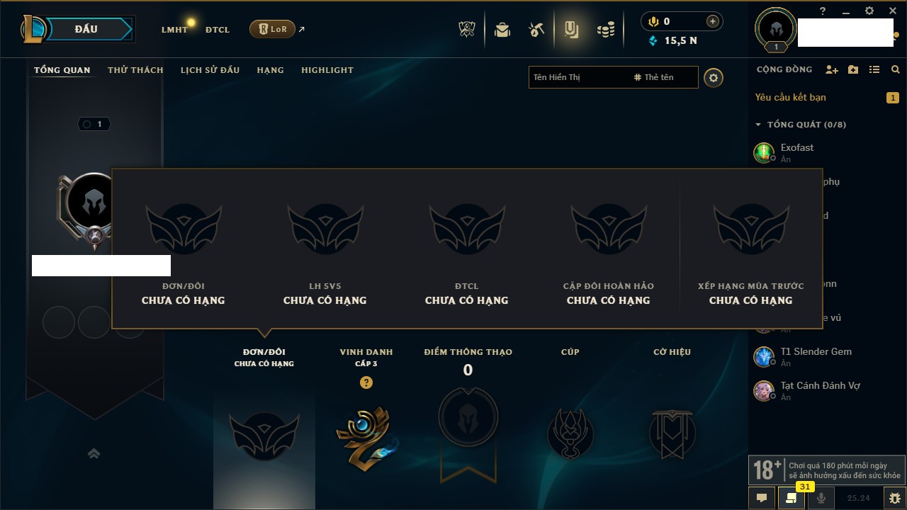 Rank Đơn: Chưa Rank Khung: Sắt Tướng: 161 - Còn 40493 THX Trang Phục: 15 Rank ĐTCL: Chưa Rank Linh Thú: 164